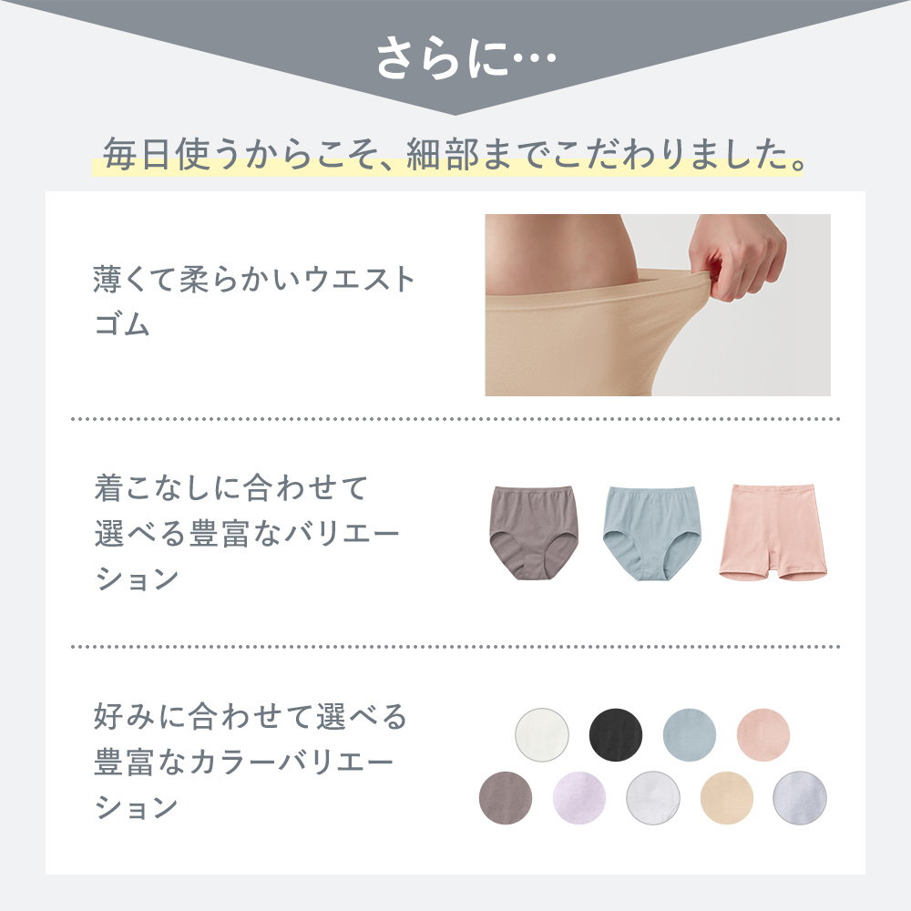ウエストと足ぐりのゴムを薄く、柔らかく改良して、よりお肌にやさしい着心地になりました。