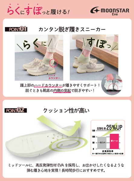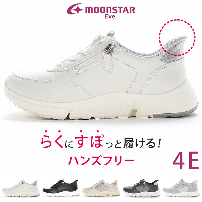 ムーンスター イブ スニーカー レディース 履きやすい 歩きやすい 疲れない 滑らない ハンズフリー 軽量 外反母趾 幅広 4E EVE 334 おしゃれ 通勤 シューズ 靴