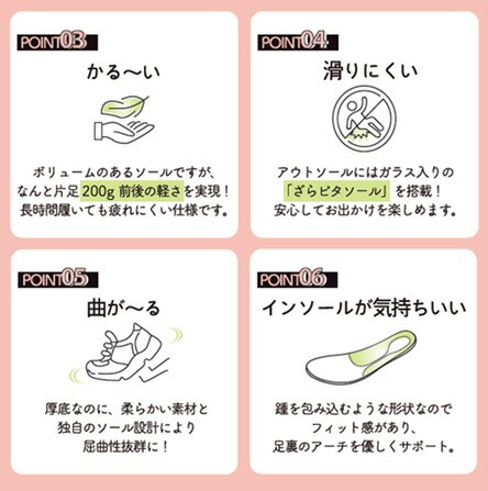 歩行時の足・膝・腰にかかる負担を和らげるよう衝撃を吸収する素材を使用しています。