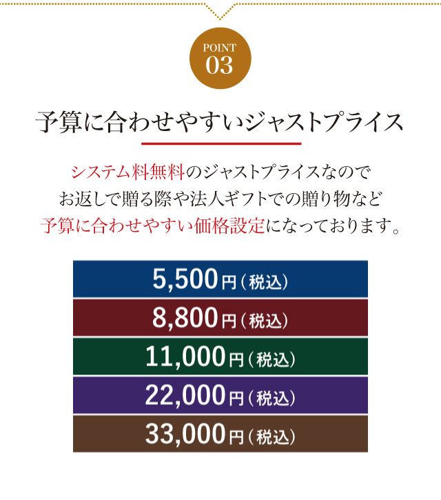予算に合わせやすいシステム料無料のジャストプライスカタログギフト。ジャストプライスなのでお返しで贈る際や法人ギフトでの贈り物など予算に合わせやすい価格設定になっております。お中元やお歳暮のほか、コンパクトなサイズなので手土産にもオススメです。