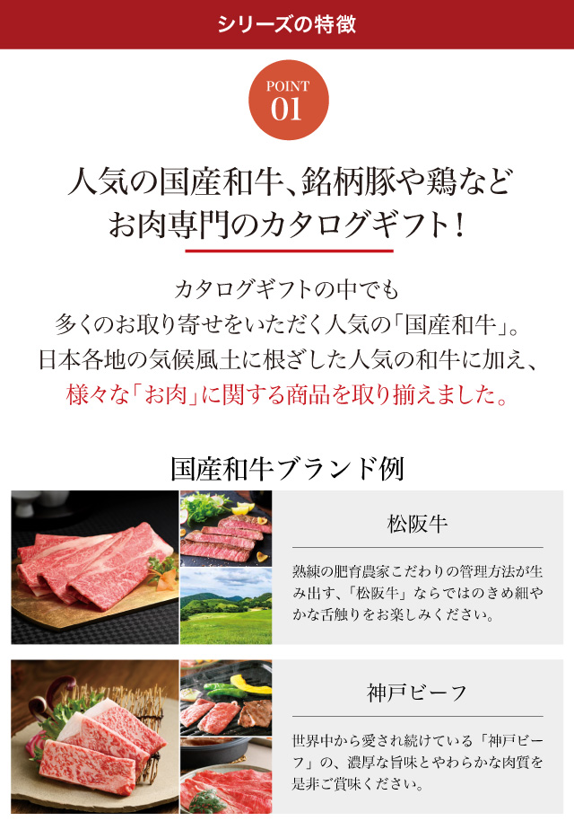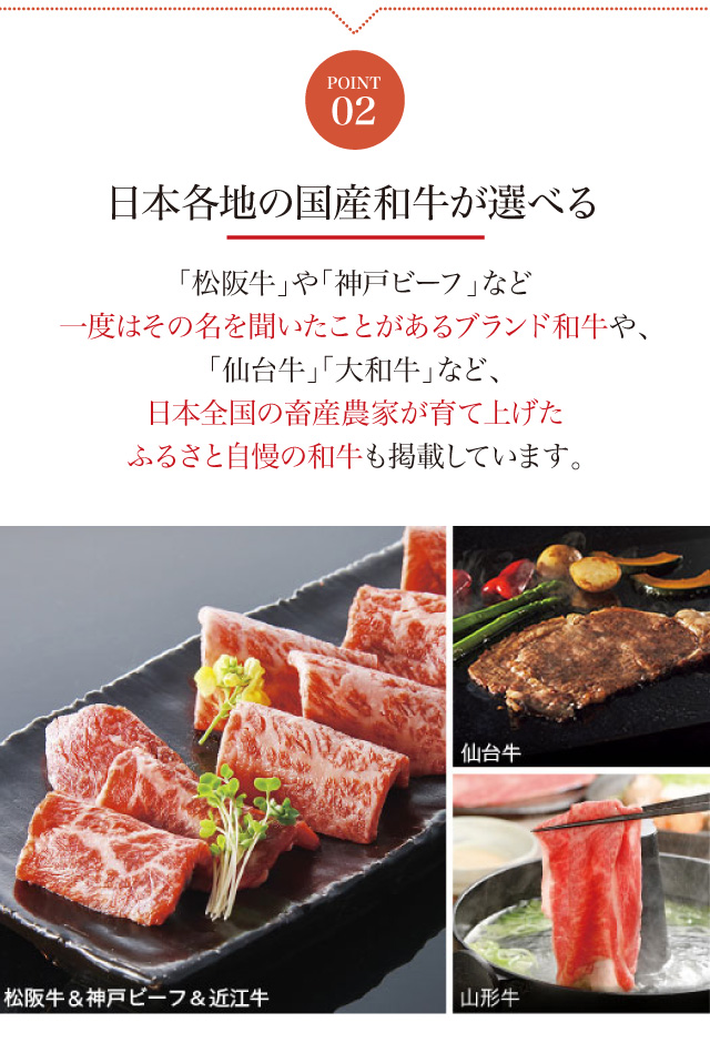 「仙台牛」「大和牛」など、日本全国の畜産農家が育て上げたふるさと自慢の和牛も掲載。