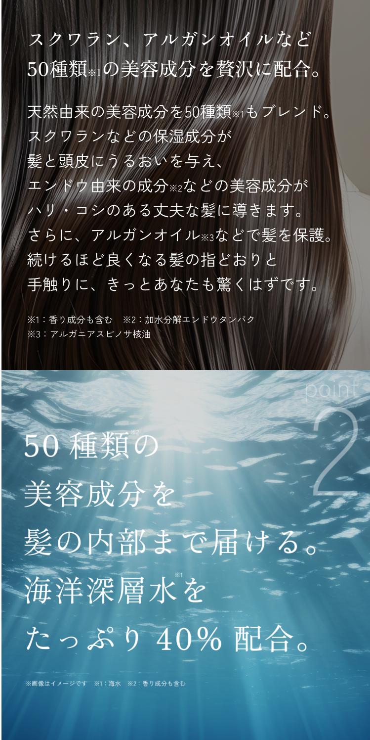 | 成分 | 海水、水、エタノール、プロパンジオール、PCA-Na、ベタイン、グリセリン、トレハロース、エーデルワイス花/葉エキス、チャ葉エキス、セイヨウハッカ葉エキス、ビート根エキス、ポリ-ε-リシン、加水分解エンドウタンパク、クミンエキス、ヒドロキシプロピルトリモニウム加水分解ケラチン(羊毛)、イノシトール、ブッソウゲ葉エキス、フルボ酸、ヒアルロン酸Na、ヒアルロン酸ヒドロキシプロピルトリモニウム、加水分解コラーゲン、ジラウロイルグルタミン酸リシンNa、トゲキリンサイ/ヒヂリメン/ミツイシコンブ/ウスバアオノリ/ワカメエキス、ミツイシコンブ/ワカメエキス、ソルビトール、セリン、グリシン、グルタミン酸、アラニン、リシン、アルギニン、トレオニン、プロリン、水添レシチン、テトラヘキシルデカン酸アスコルビル、トコフェロール、パンテノール、パルミチン酸レチノール、ピーナッツ油、スクワラン、アルガニアスピノサ核油、α-グルカン、グルコシルセラミド、グリコシルトレハロース、ラミナリアオクロロイカエキス、スイカズラ花エキス、加水分解水添デンプン、酸化銀、ホウケイ酸(Ca/Na)、PEG-50水添ヒマシ油、トリ(カプリル酸/カプリン酸)グリセリル、オレンジ油、アオモジ果実油、BG |