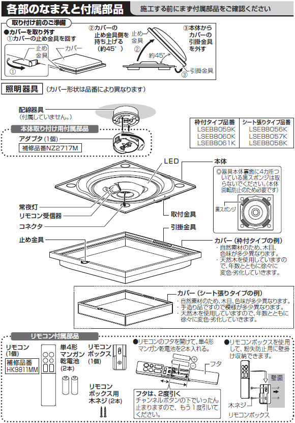 付属部品 リモコン(1個)、単4形乾電池(お試し用)(2本)、リモコンボックス(1個)、リモコンボックス用木ネジ(2本)、アダプタ(NZ2717M)(1個)