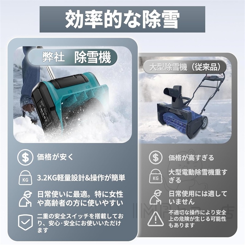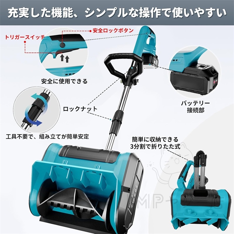 ご家族、特に女性やご年配の方にも安心してお使いいただけるよう、安全性と操作性にこだわりました。誤作動を防ぐ両手操作スイッチと、姿勢に合わせて高さを調節できる補助ハンドルで、体に負担をかけず、楽な姿勢で作業を続けられます。 本体はバッテリーを外せば約3kgととても軽量。若い方からご年配の方まで、また初心者の方でも楽に扱えます。使い終わった後は3分割で折りたためるので、物置やクローゼットのわずかな隙間にもすっきり収納可能。片付けの手間もほとんどかかりません。初めての方でも迷わず使える、直感的な設計。これ一台で、ご家族みんなの冬の雪かきを、軽やかにサポートします。