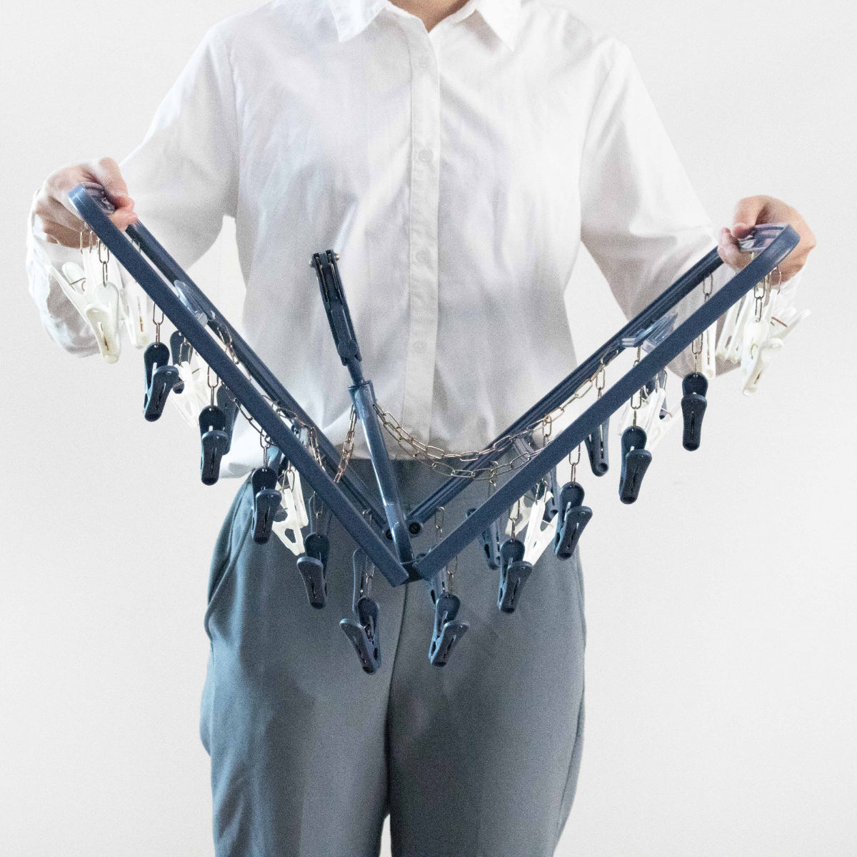 上折れ式でサッと広げられ、ピンチが絡みにくい設計です。使わないときは折りたたんで、洗濯機横やクローゼットの隙間にもスッキリ収納できます。