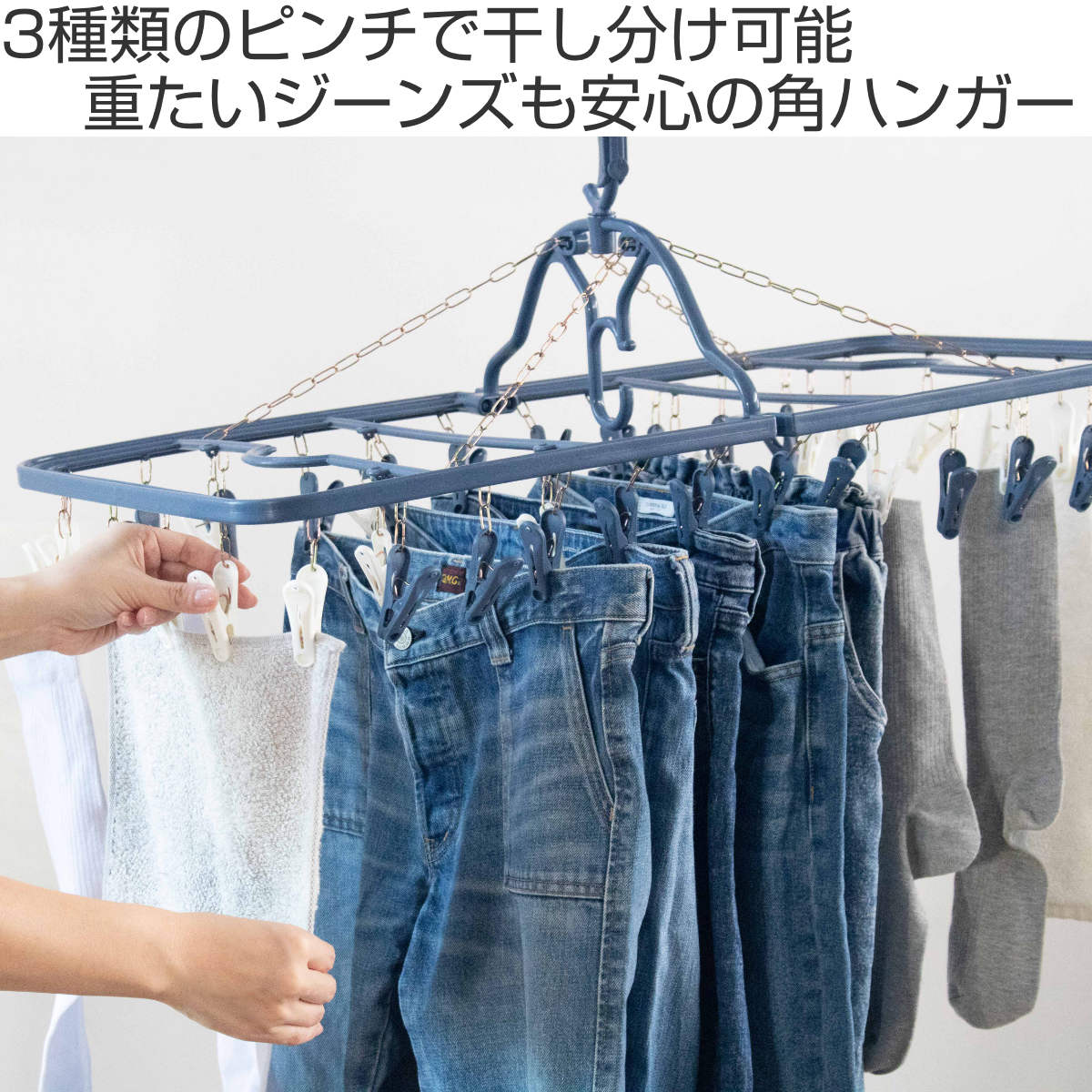 ジーンズもまとめて干せる、頑丈なストロングフレームと金属チェーンを採用した干し分け角ハンガーです。安定感があり、重たい衣類や厚手のジーンズも安心して干せます。毎日の洗濯でも揺れにくく、効率よく乾かせます。