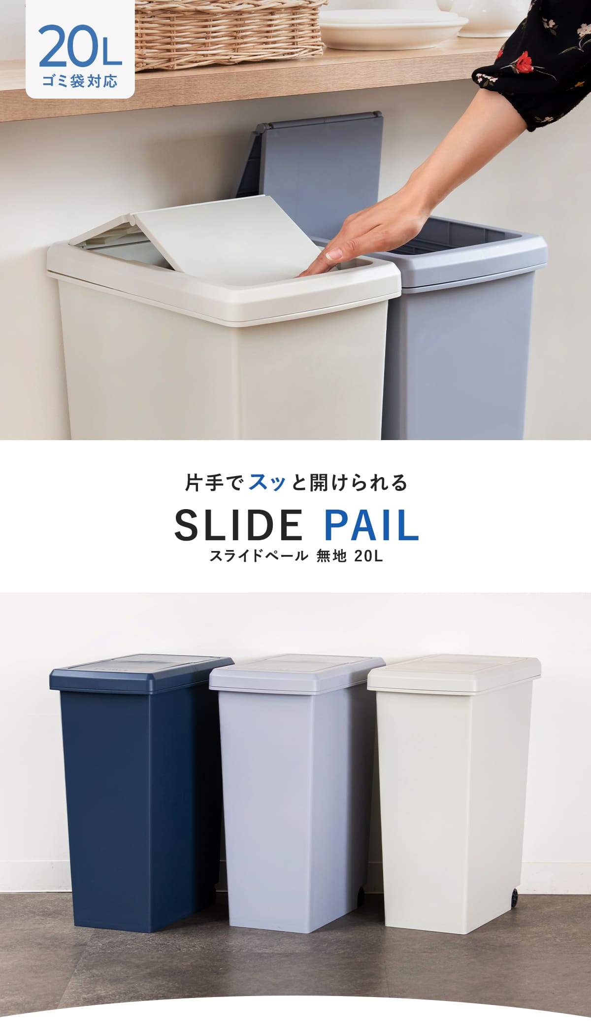 ●片手で簡単に開閉できるスライドオープン式のゴミ箱です。