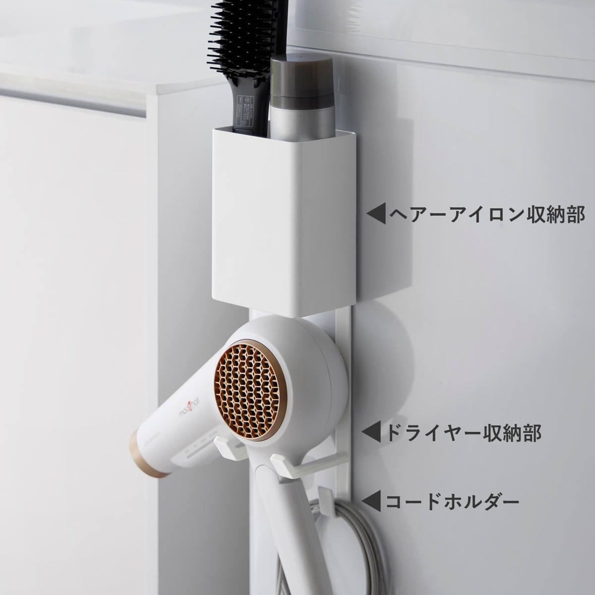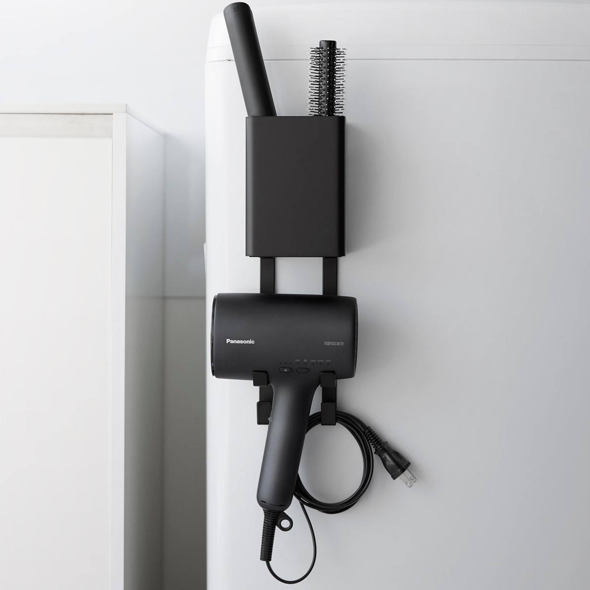 ●ドライヤーやヘアーアイロンを、洗濯機横にすっきり一括収納できるマグネットホルダーです。