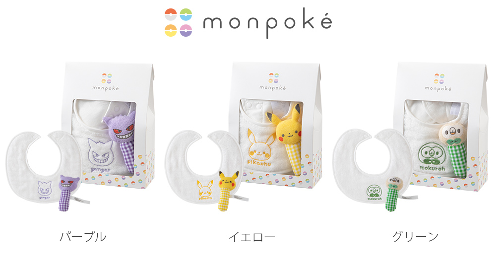 モンポケ 日本製 小物ギフトセット スタイ ラトル 出産祝い ギフト セット プレゼント 刺繍 泉州タオル 綿100 綿 グリーン 緑 イエロー 黄色 パープル 紫 肌に優しい よだれかけ おもちゃ ガラガラ 赤ちゃん ベビー ベビー用品 男の子 女の子 ポケモン ポケットモンスター ピカチュウ キャラクター 犬印本舗 犬印