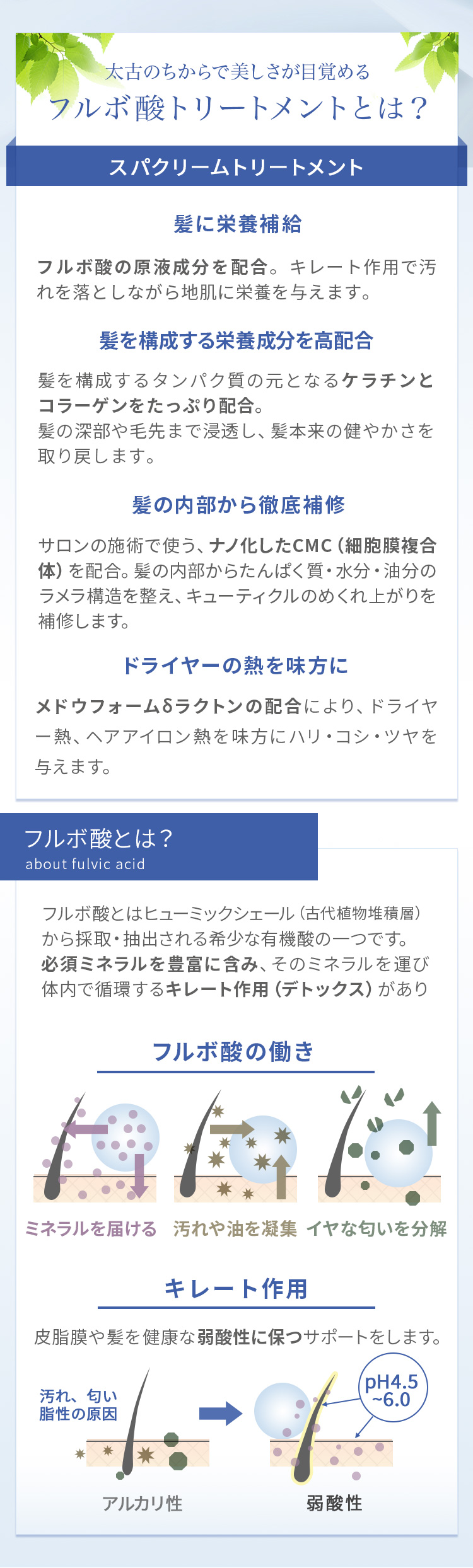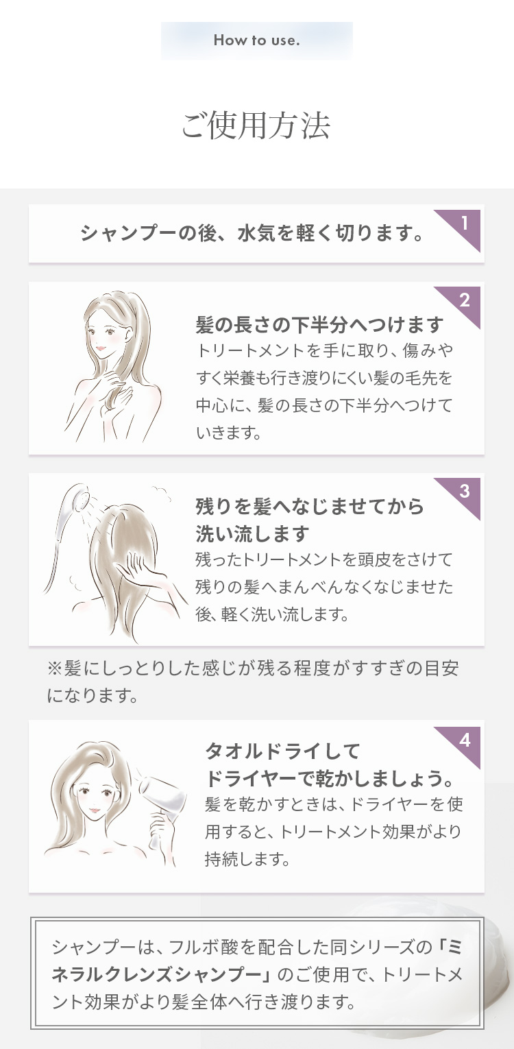 70種類以上のミネラルを含むフルボ酸原液成分を配合したトリートメント。