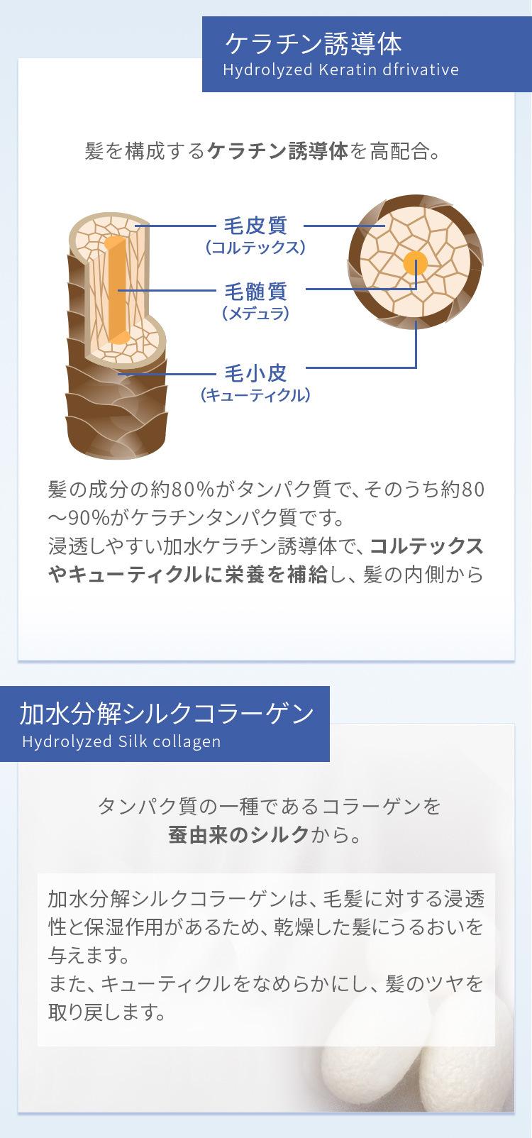 髪を構成するたんぱく質の元となるケラチン、コラーゲンをたっぷり配合。