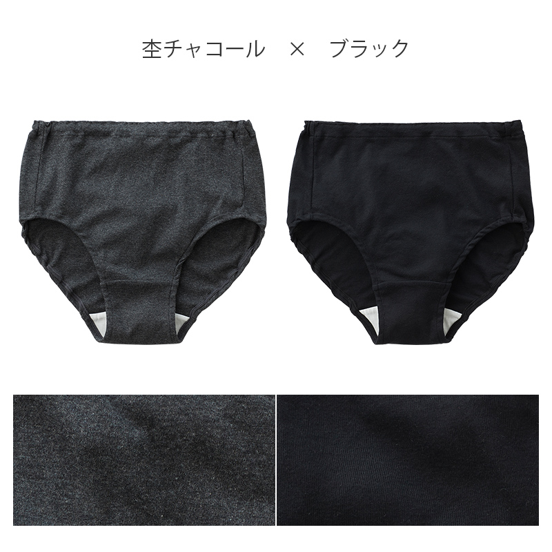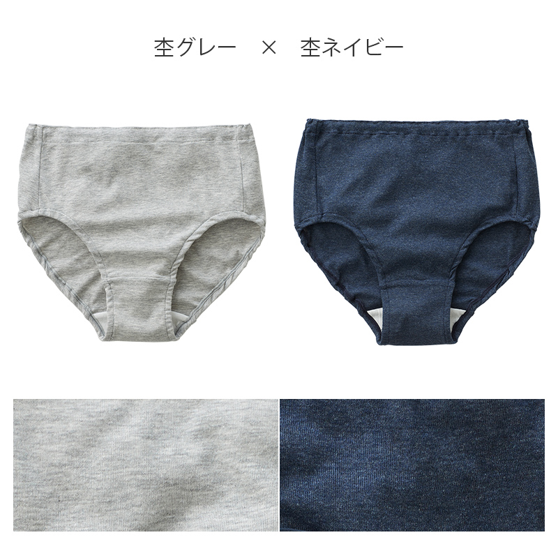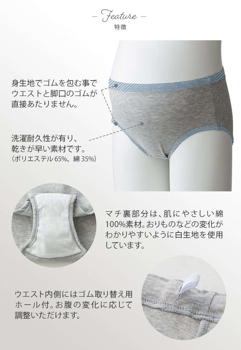 ストレスフリーなはき心地。身生地でゴムを包むことでウエストと脚口のゴムが直接あたりません。ウエスト部分にはゴムの取替え口があるので、お腹の変化に応じて調整できます。洗っても乾きやすい綿混ポリエステル素材。洗い替えに便利な2枚組です。