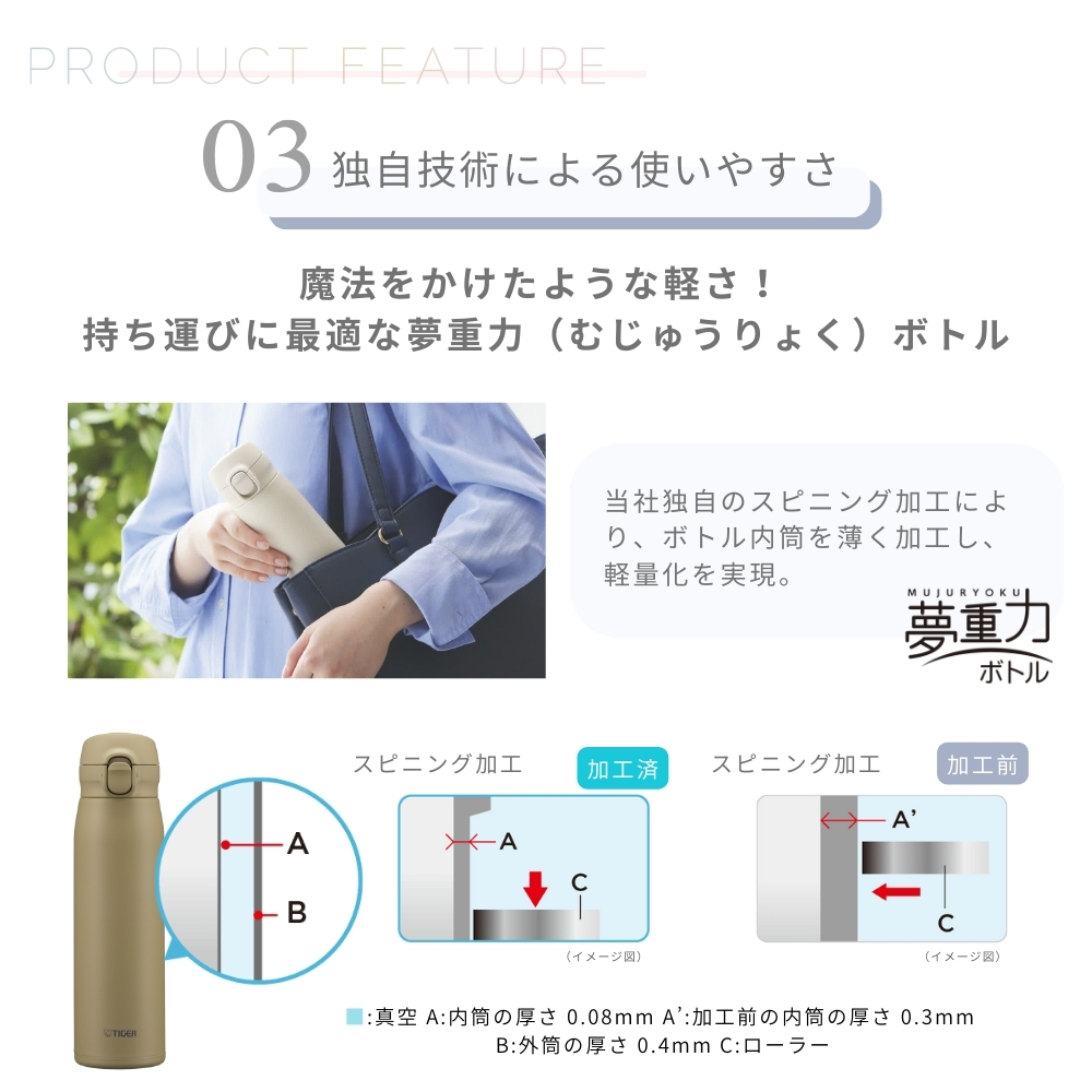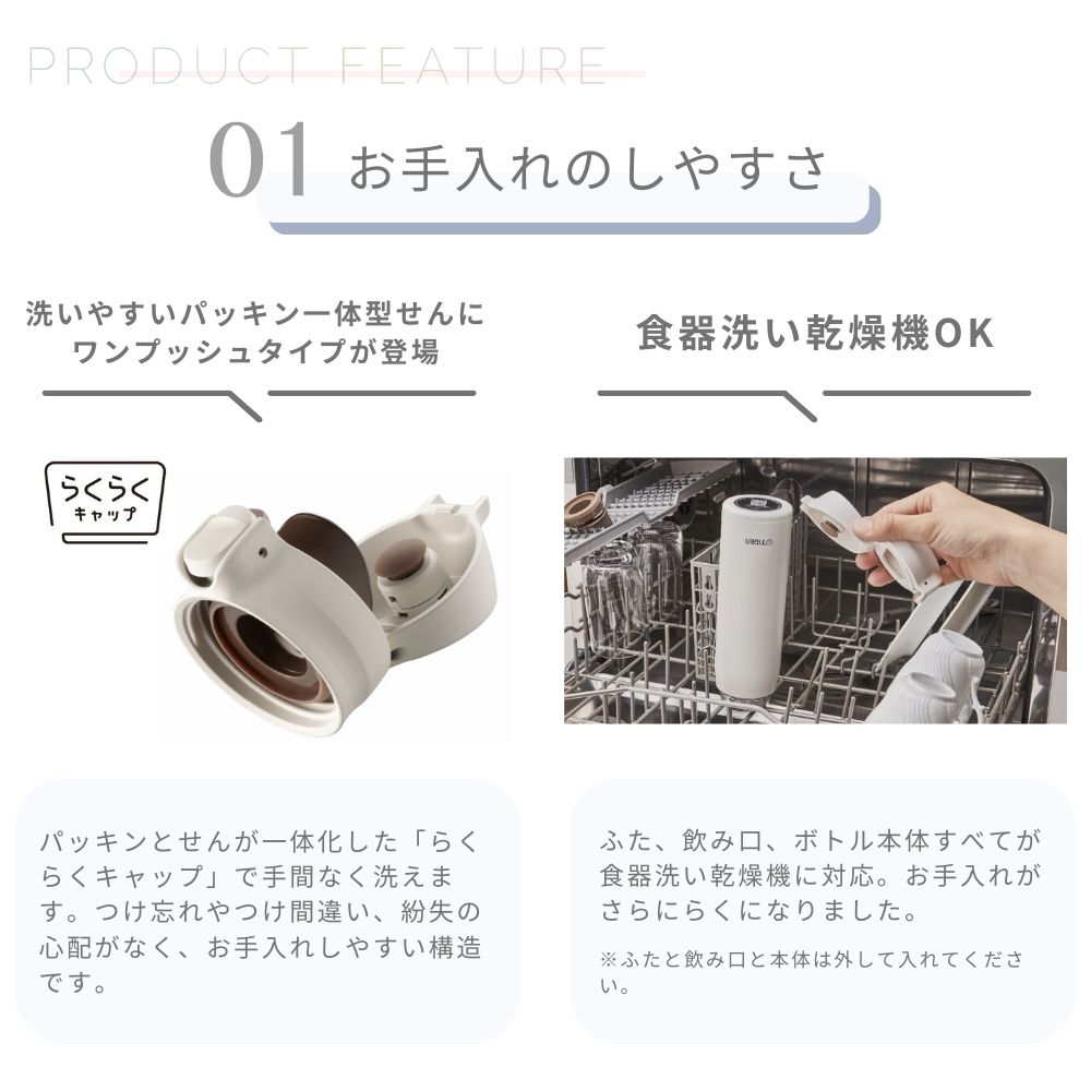 | 商品名: タイガー魔法瓶 真空断熱ボトル 水筒 600ml MKR-W060 保温 保冷 パッキン一体型 ワンプッシュ マグ マグボトル 食器洗い乾燥機対応 軽量 スポーツドリンク ステンレス スリム 直飲み -商品説明- お手入れ・飲みやすさに こだわったワンプッシュマグ(水筒) 真空断熱ボトル MKR-W060 お手入れかんたん パッキン一体型せん「らくらくキャップ」 日々のお手入れがらくに! 片手で飲みやすい ワンプッシュマグタイプ ワンプッシュで飲みやすい! 片手でサッと水分補給 飲み口のフィット感 お手入れのしやすさ 洗いやすいパッキン一体型せんにワンプッシュタイプが登場 パッキンとせんが一体化した「らくらくキャップ」で手間なく洗えます。 つけ忘れやつけ間違い、紛失の心配がなく、お手入れしやすい構造です。 食器洗い乾燥機OK ふた、飲み口、ボトル本体すべてが食器洗い乾燥機に対応。お手入れがさらにらくになりました。 ※ふたと飲み口と本体は外して入れてください。 進化した飲み心地 人間工学に基づいたタイガー史上最も飲みやすいボトル※ ※当社従来品真空断熱ボトルのワンプッシュタイプのマグボトルとの比較(当社調べ) ・開閉ボタンが押しやすい ・ロック構造が分かりやすく操作しやすい ・飲むときの唇への不快感が少ない ・飲み口形状が唇にフィットして飲みやすい 独自技術による使いやすさ「夢重力ボトル」 魔法をかけたような軽さ! 持ち運びに最適な夢重力(むじゅうりょく)ボトル 当社独自のスピニング加工により、ボトル内筒を薄く加工し、軽量化を実現。 0.5Lサイズは約210gと軽量なので、持ち運びがラクにおこなえます。 汚れ・においがつきにくく サビに強いから衛生的 ボトルの内面には、なめらかで光沢のあるスーパークリーンPlusを施しました。 汚れ・においがつきにくく、サビにも強いので塩分を含むスポーツドリンクを入れてもOK。 ※使用後はすぐに水ですすぐなど、お手入れしてください。 真空断熱でしっかり保温・保冷し、飲みごろの温度を6時間以上キープ ステンレス製真空2重構造により、飲みごろの温度を約6時間以上キープ。 軽さのある洗練されたソフトなニュアンスカラーを採用。 様々なシーンにマッチします。 -特徴・品質- ・ステンレス製真空二重構造で高い保温・保冷効果を実現。 ・軽量で耐久性に優れた「夢重力ボトル」設計。 ・汚れやにおいがつきにくいスーパークリーンPlus加工で衛生的。 -仕様- ・カラー:オークルベージュ、ランプブラック、オリーブグリーン ・容量:0.6L ・保温効力(6時間):72℃以上 ・保温効力(1時間):87℃以上 ・保冷効力(6時間):8℃以下 ・サイズ :(約)幅6.9×奥行7.5×高さ25cm ・質量:(約)0.24kg ・口径:(約)4cm ・生産国:ベトナム ※ 保温効力とは、室温20度±2度において、製品に熱湯を満たし、縦置きにした状態で湯温が95度±1度の時から1時間および6時間放置した場合におけるその湯の温度です。 ※ 保冷効力とは、室温20度±2度において、製品に冷水を満たし、縦置きにした状態で水温が4度±1度の時から6時間放置した場合におけるその水の温度です。 -機能- ・片手で簡単に開閉できるワンプッシュマグタイプ。 ・食器洗い乾燥機対応でお手入れが簡単。 ・人間工学に基づいた飲み口で快適な飲み心地を提供。 -使用・手入れについて- ボトル本体、ふた、飲み口は食器洗い乾燥機で洗浄可能です。必ず分解してから洗ってください。使用後はスポーツドリンクなどを入れた場合はすぐにすすいでください。 -注意事項- ・商品の色はできる限り実物に近づけていますが、ディスプレイ設定や撮影条件により色味が異なる場合があります。ご了承ください。 ・ご注文のタイミングや内容により、購入後のキャンセルや修正が制限される場合があります。 ・同時に複数のご注文があった場合、システム上の遅延により在庫がないにも関わらず購入できてしまう場合があります。そのような場合は速やかにメールでお知らせいたします。 |