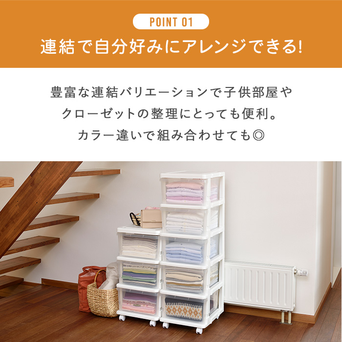 | 特徴 | 豊富な連結バリエーションで子供部屋やクローゼットの整理にとっても便利!! フォルムがシンプルデザインなので、リビングでも大活躍!! キャスター付きで、クローゼットからの出し入れも簡単。 |