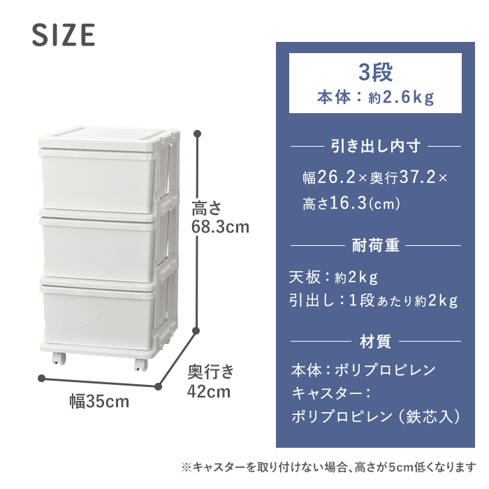 | 収納目安(一段あたり) | Yシャツなら6枚 セーターなら4枚 バスタオルなら4枚 |