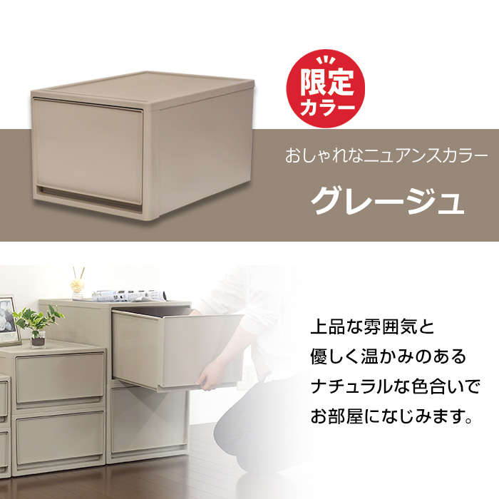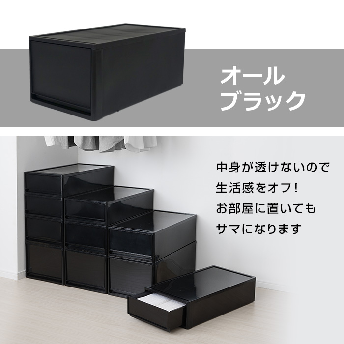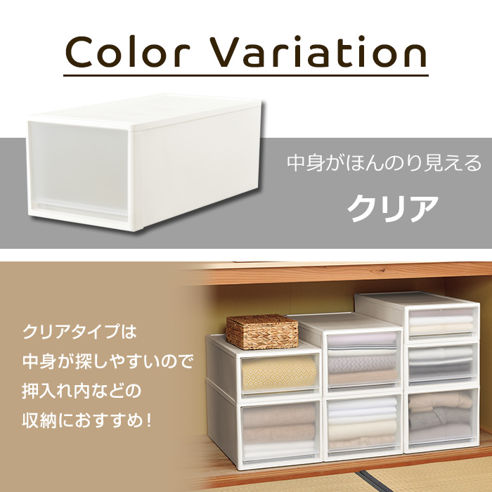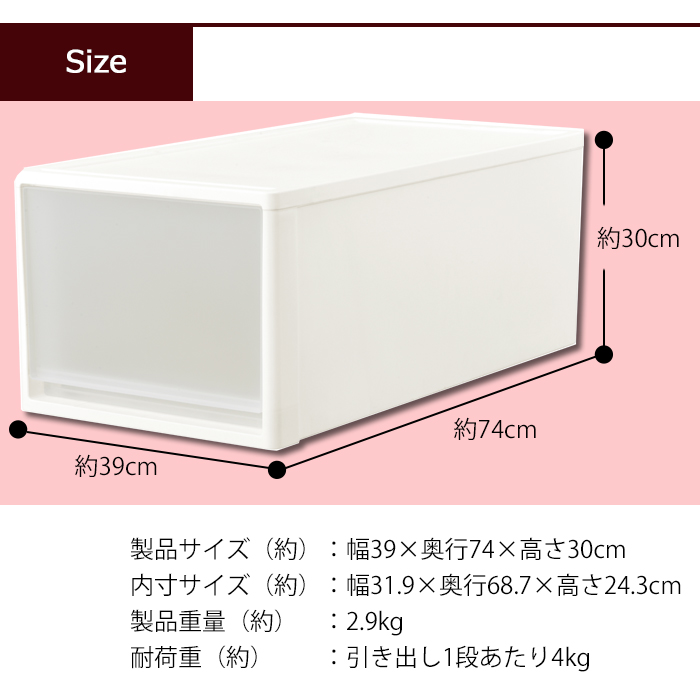 | 特徴 | 押入れやクローゼットにすっきり収納! 押入れ収納にオススメの奥行74cm・高さ30cmの1段引出し収納。 新カラーで引き出しがうっすら透けてるスモークブラックが登場! 積み重ねてもずれない凹凸構造で、多段チェストとしても利用可能。 シンプルなつくりだからこそ、見出しやステッカー等を貼ってアレンジも自由自在。 |