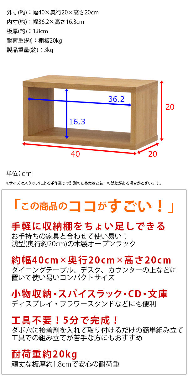 オープンラック 1段 40×20 奥行20cm 収納 棚 薄型 おしゃれ 組み合わせ自由 幅40cm 高さ20cm 頑丈 耐荷重20kg 積み重ね 収納 ラック ディスプレイラック