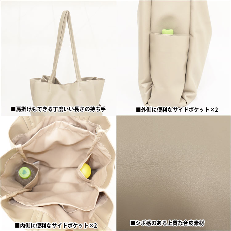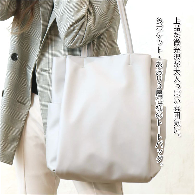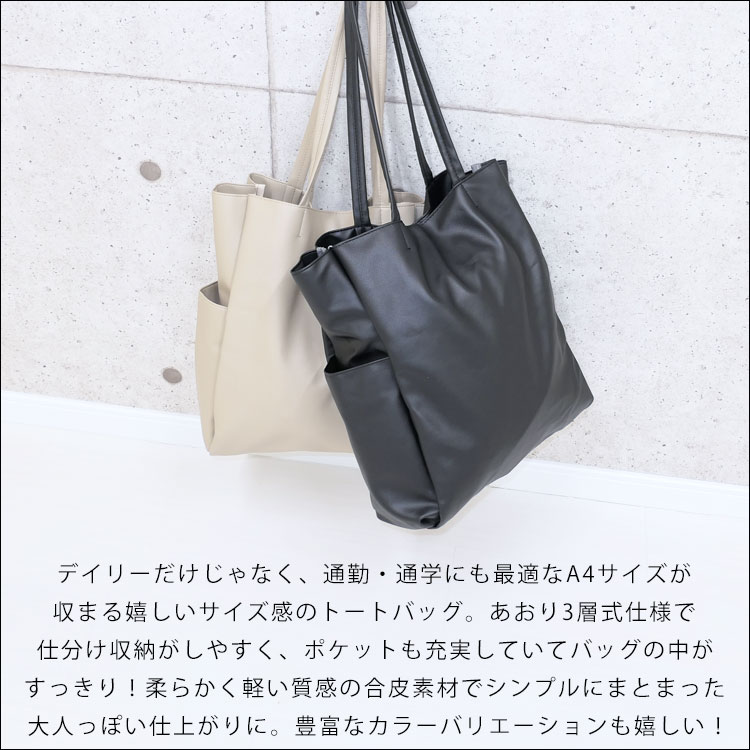 | Point | ・スクエアデザインの大人きれいめレザートートバッグ♪ ・A4サイズ収納可能で通勤通学/マザーズバッグにおすすめ。 ・あおり3層式仕様で仕分け収納がしやすくポケットも多い! ・軽い設計で上品な微光沢がかわいい。シンプルなので年中使える♪ ・使いやすい丈夫で大容量な鞄は女子へのプレゼントに人気。 |