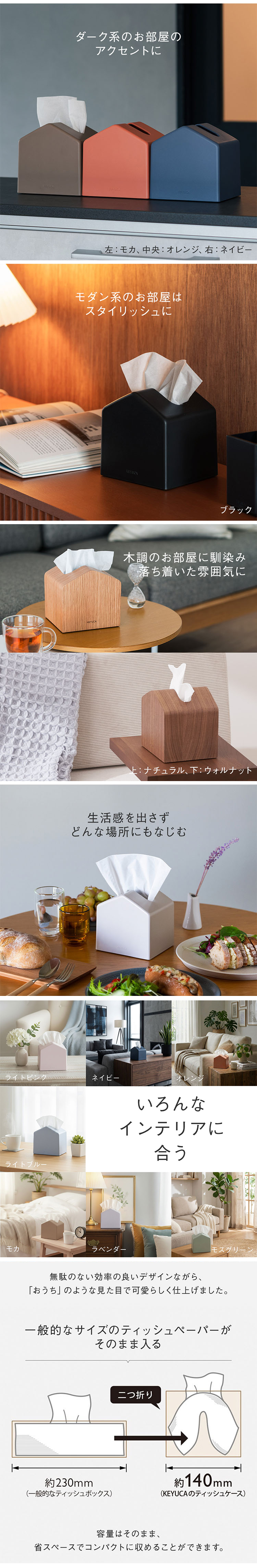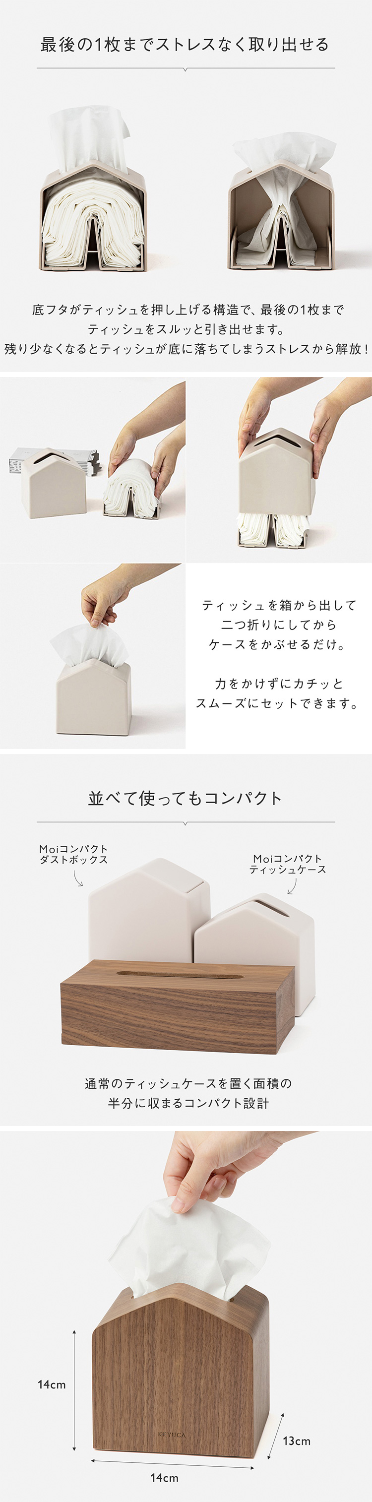 KEYUCAの「コンパクトティッシュケース」は幅が約140mmとコンパクト。