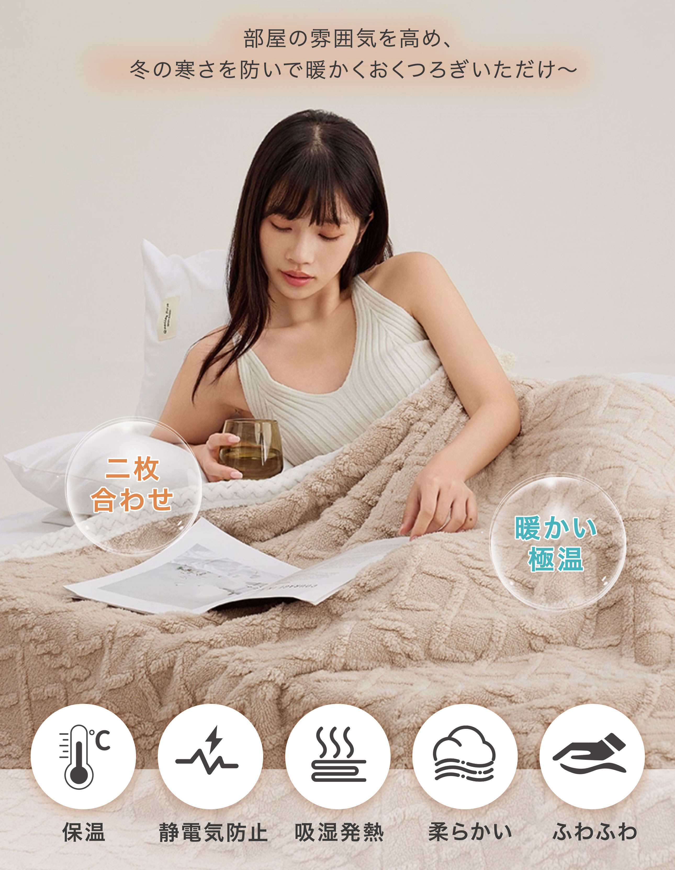 | 【とろける触感】うさぎのように柔らかい“ふわとろ”生地で全身をやさしく包み込みます。 【吸湿発熱×蓄熱】湿気を熱に変えてキープ。エアコン冷え対策にも活躍。 【軽量なのに暖か】肩も足元もぬくぬく、長時間の使用でも重さを感じにくい。 【洗える&抗菌防臭】ご家庭で丸洗いOK。毎日清潔に使えます。 【マルチに使える】ベッド・ソファ・車内・オフィス・お昼寝・ひざ掛けまで幅広く。シンプルでインテリアに馴染みます。 |