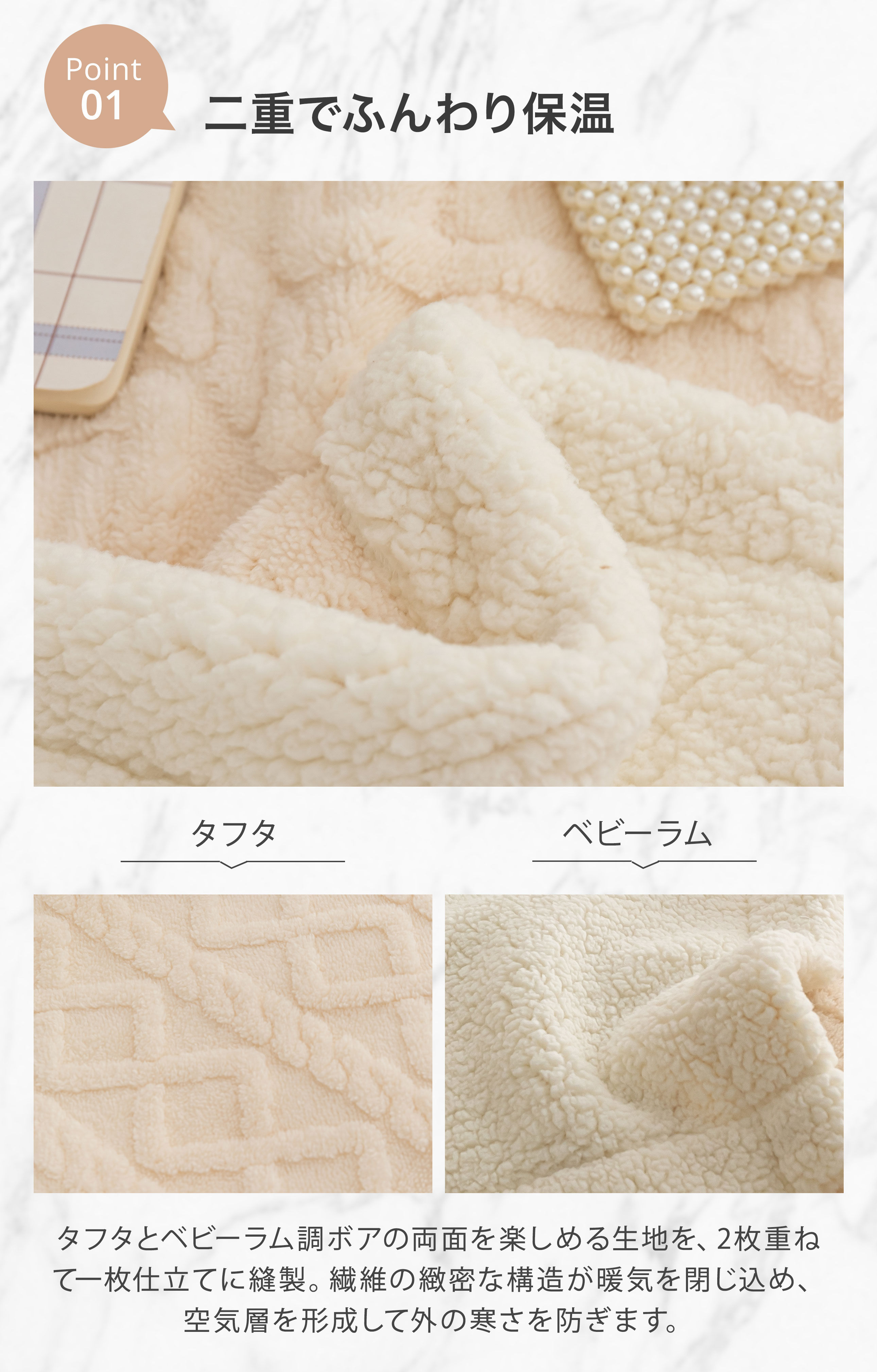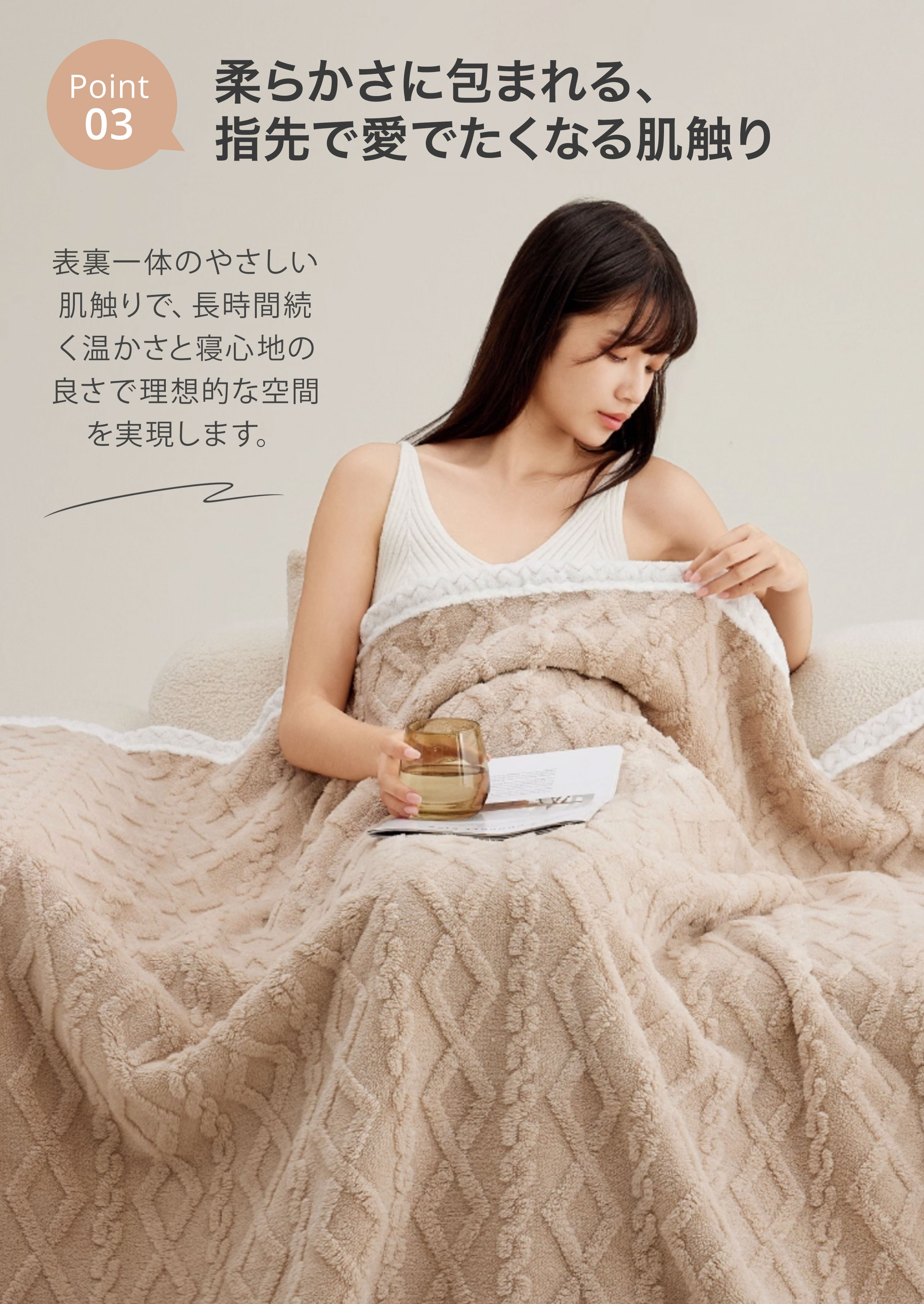 軽量&あったか:厚みはしっかり、重さは軽やか。肩から足先まで包まれても“重だるさ”を感じにくい。