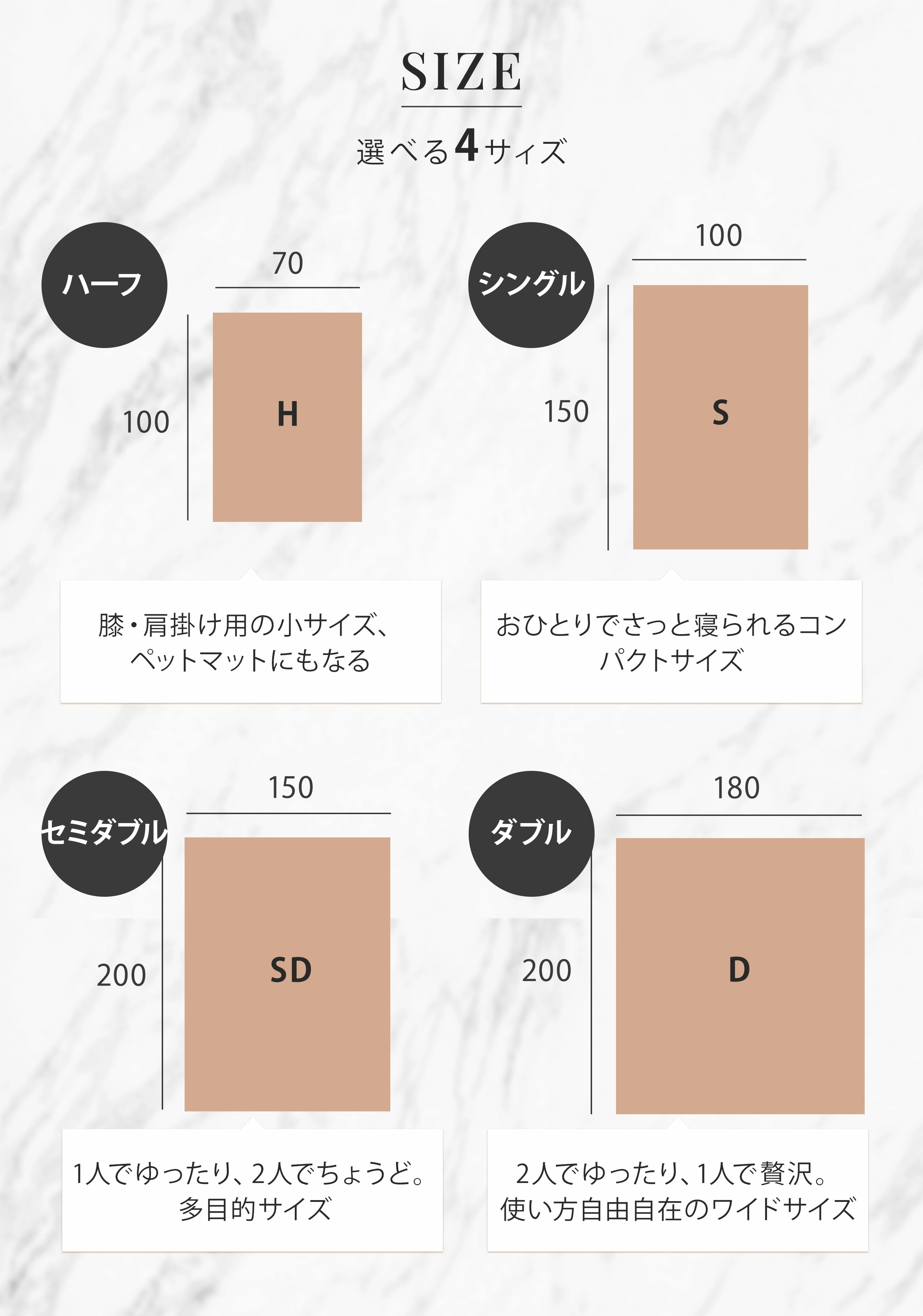 | シングル:約100×150cm ハーフ:約70×100cm セミダブル:約150×200cm ダブル:約180×200cm ※個体差により±数cmの誤差が生じる場合があります。 |