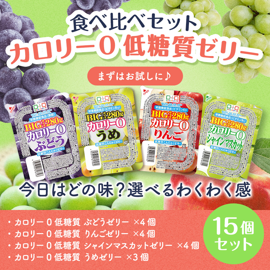 20%OFF こんにゃくゼリー 食べ比べセット 0カロリー 低糖質こんにゃくゼリー ぶどう りんご シャインマスカット うめ 1個280g 15個入