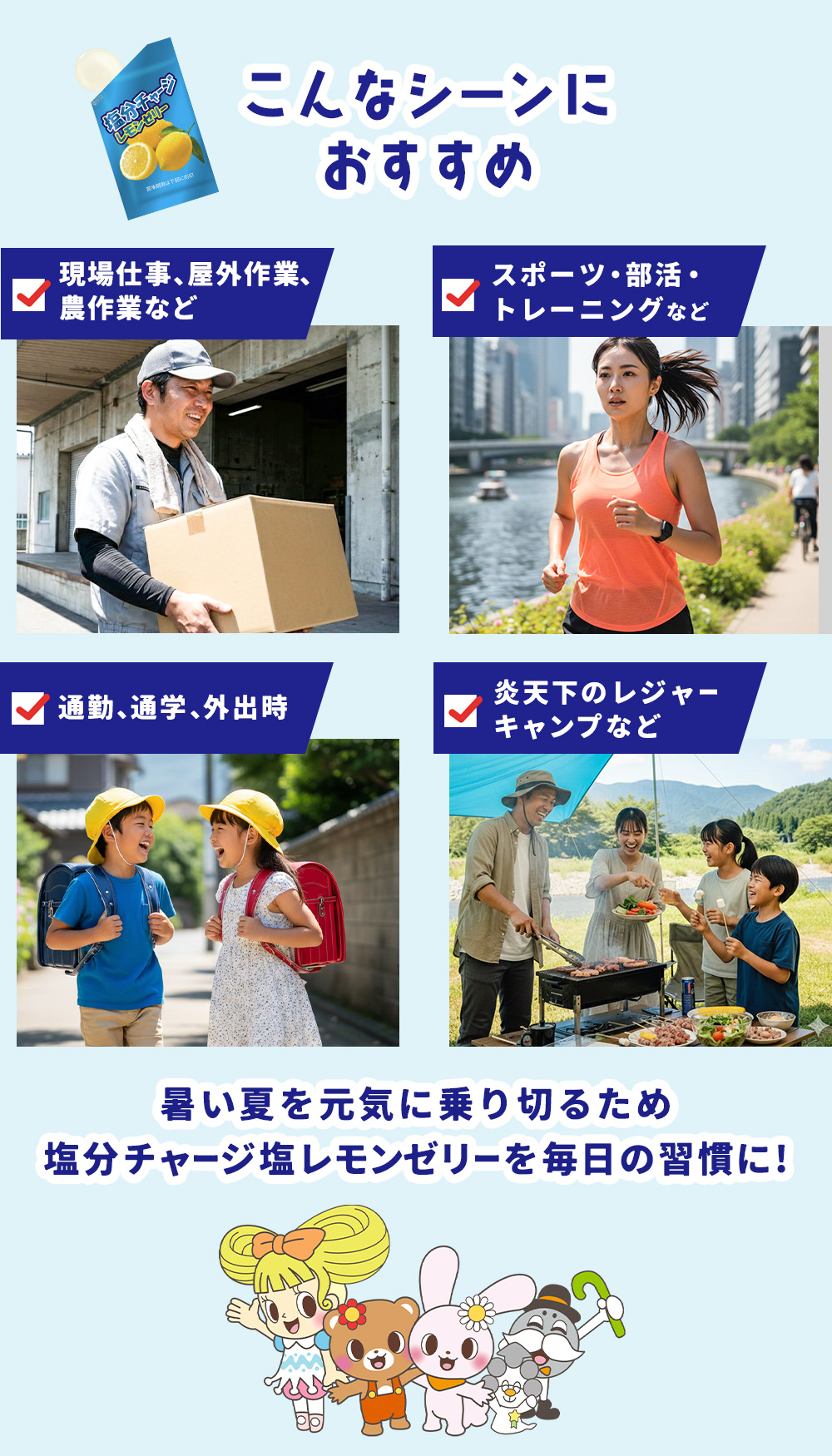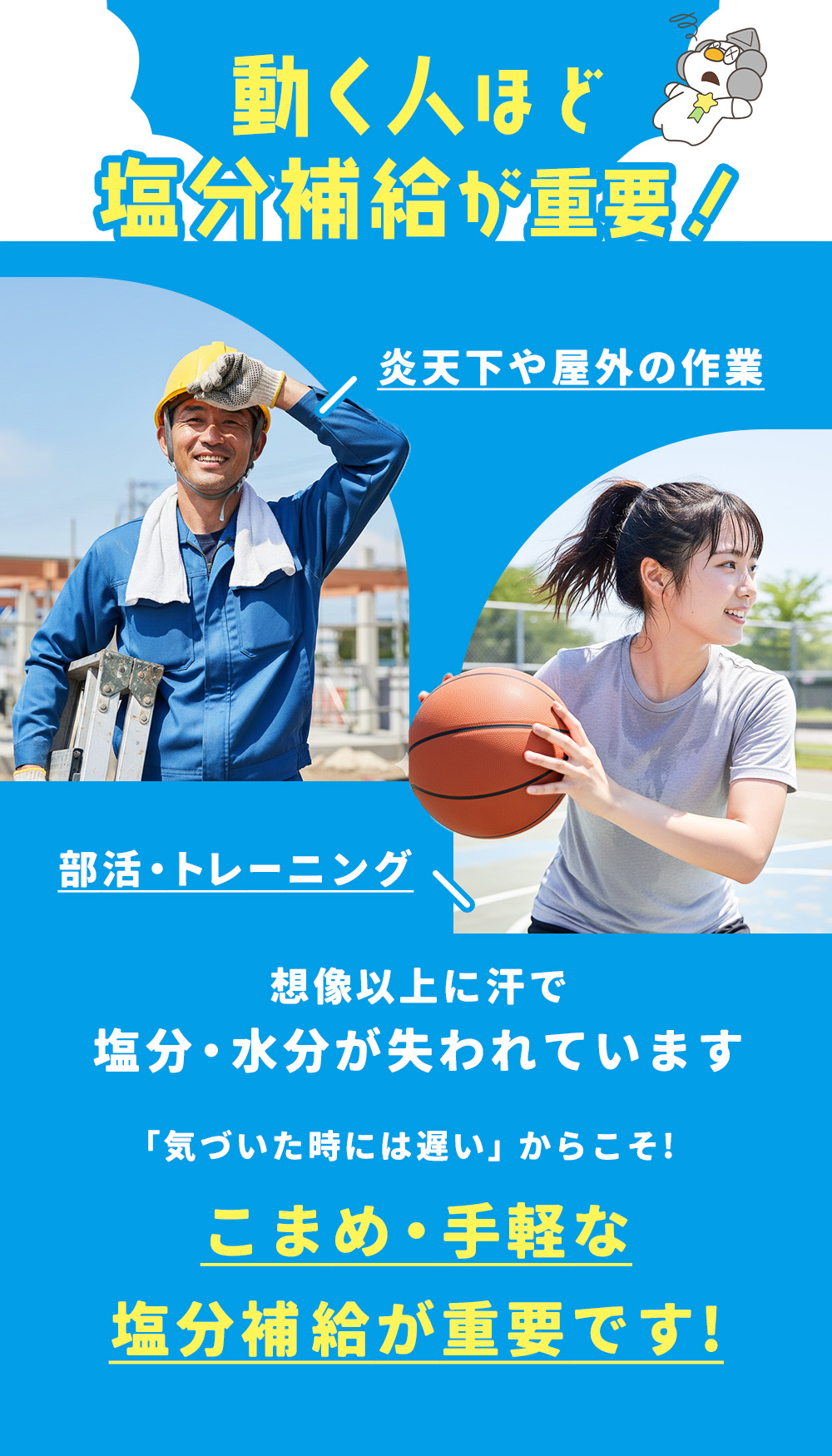 | 暑い季節の運動や外出時、屋外の現場作業や農作業時などで塩分補給に便利な個包装タイプの塩分チャージ塩レモンゼリー。こちらは1袋450g(約30個)入りの業務用サイズです。塩分補給にぴったりなクエン酸、カリウム入り。常温保存ができるから、まとめ買いをしてもいつでも使用できるようにストックも可能です。凍らせれば、塩分と冷たさを同時にチャージができ、熱中症対策にぴったりです! |