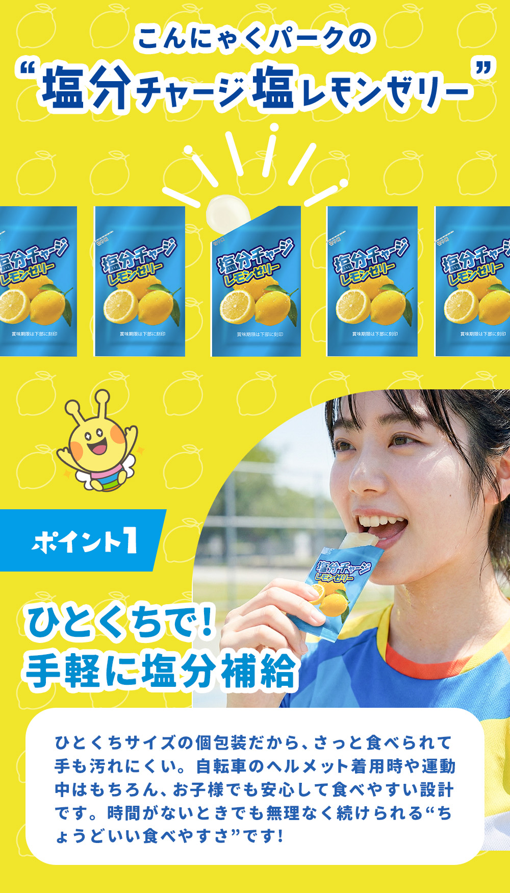 暑い季節の運動や外出時、屋外の現場作業や農作業時などで塩分補給に便利な個包装タイプの塩分チャージ塩レモンゼリー。こちらは1袋450g(約30個)入りの業務用サイズです。