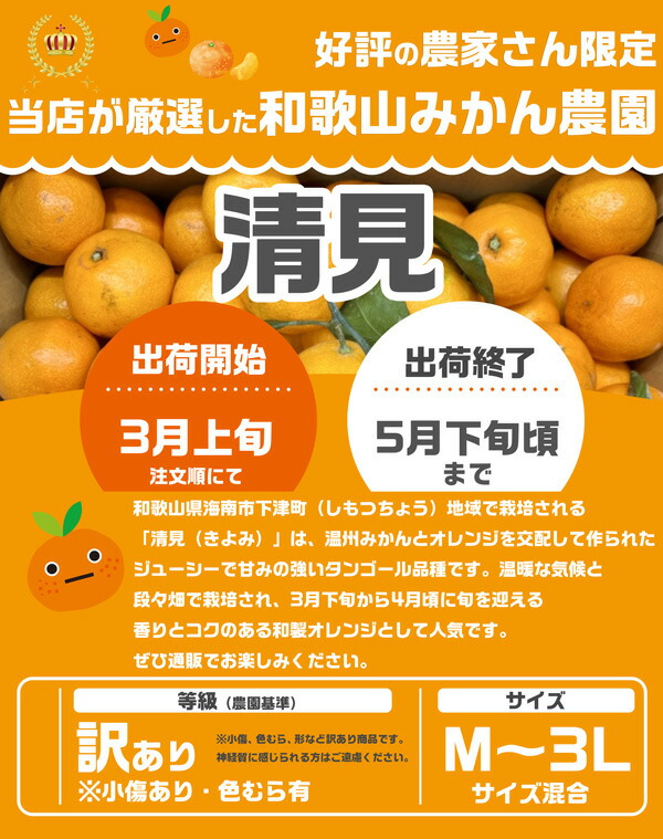 | 商品名 | 清見 和歌山 きよみ 2kg 訳あり 清美オレンジ M〜3Lサイズ混合 タンゴール 農園・生産者から出荷 【出荷日お任せ・指定日不可】バレンタイン 果物 柑橘 蜜柑 フルーツ 送料無料 |