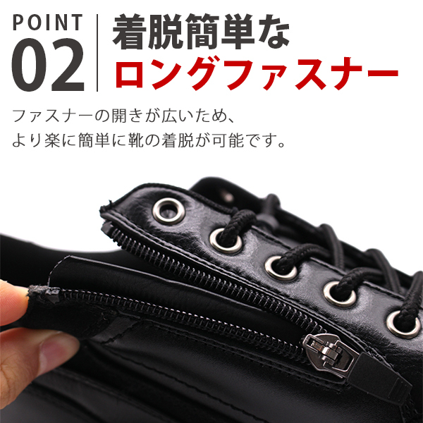 ファスナーの開きが広いため、より楽に簡単に靴の着脱が可能です。
