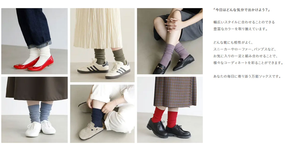 落ち着いたニュアンスカラーが豊富なカラーバリエーションで足元のアクセントに。