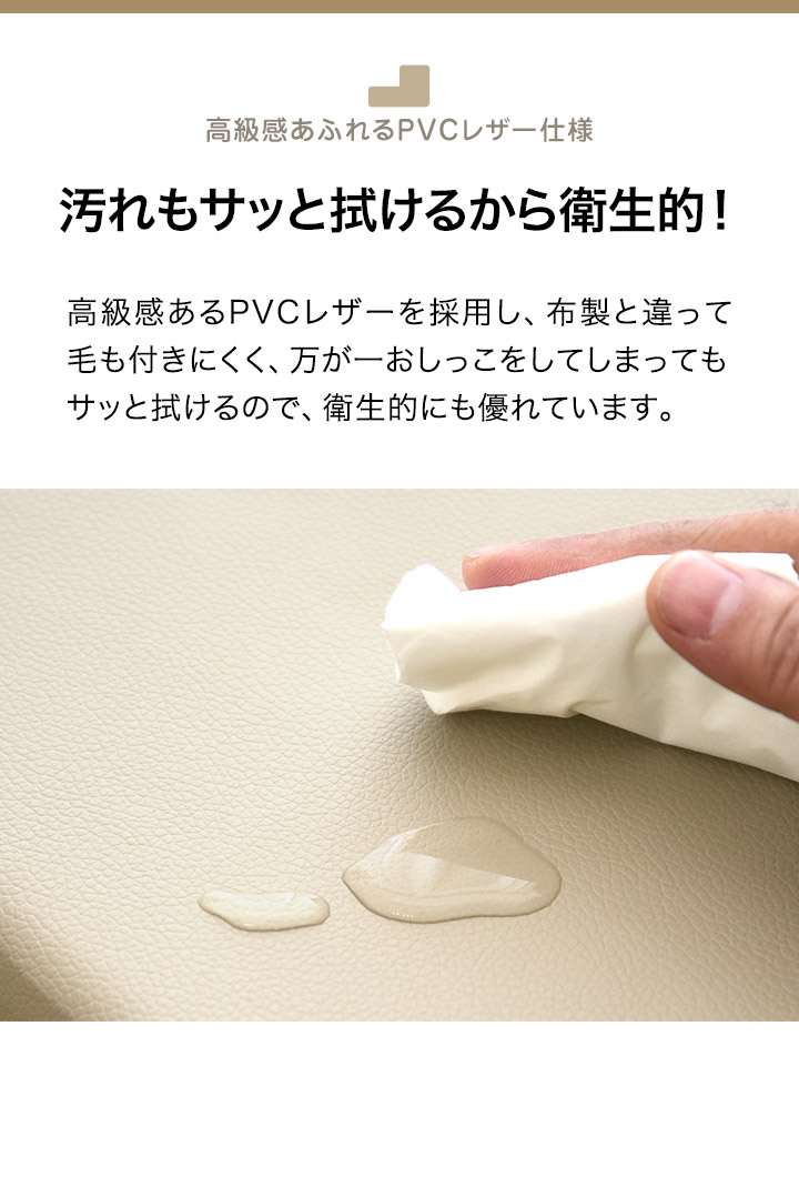 布製と異なりペットの毛が付きにくく、万が一おしっこなどで汚れてしまってもサッと拭けるので、衛生的にも優れています。