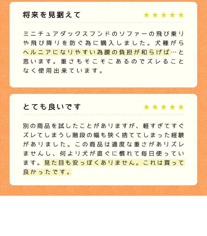 軽量ながらも滑りにくいので、愛犬が勢いよく昇り降りしても安心です。