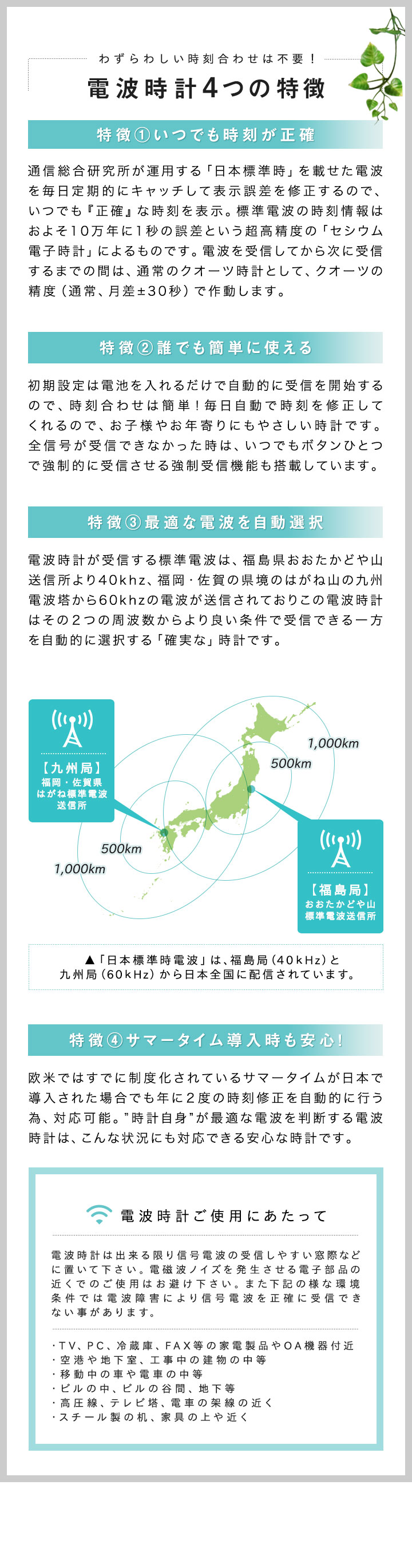 | 受信機能: 自動時刻補正(午前3時・午前4時・午前5時/日) |