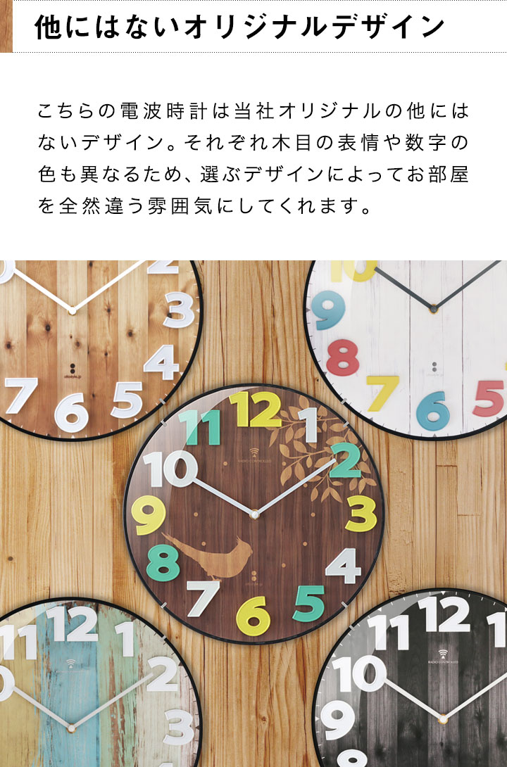 こちらの電波時計は当社オリジナルの他にはないデザイン。それぞれ木目の表情や数字の