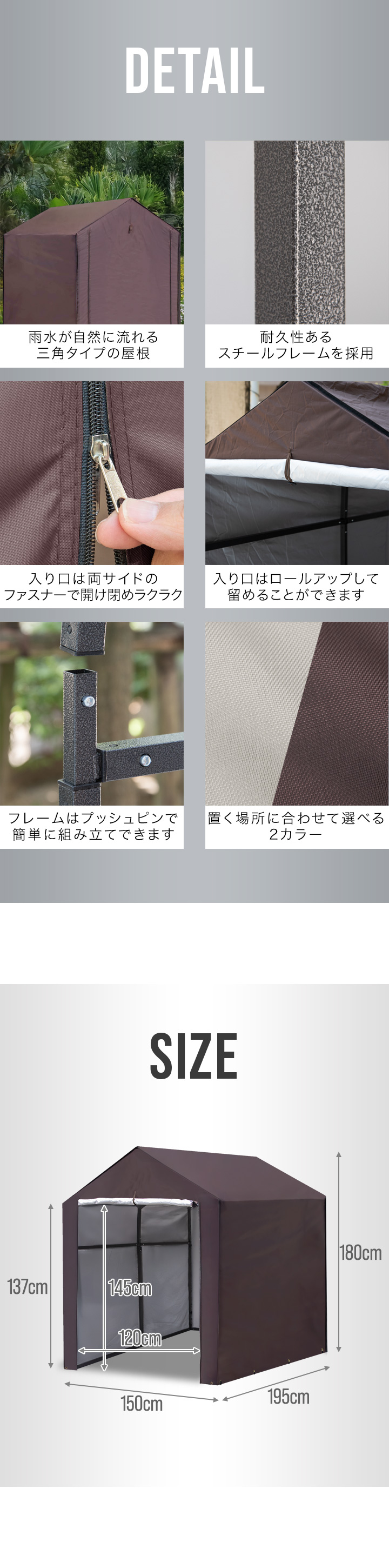 自転車、バイクの収納はもちろん、簡易的な物置としてガレージ用品や冬用タイヤ、ガーデニング用品・DIY工具、子供の遊具などの収納にもオススメです。