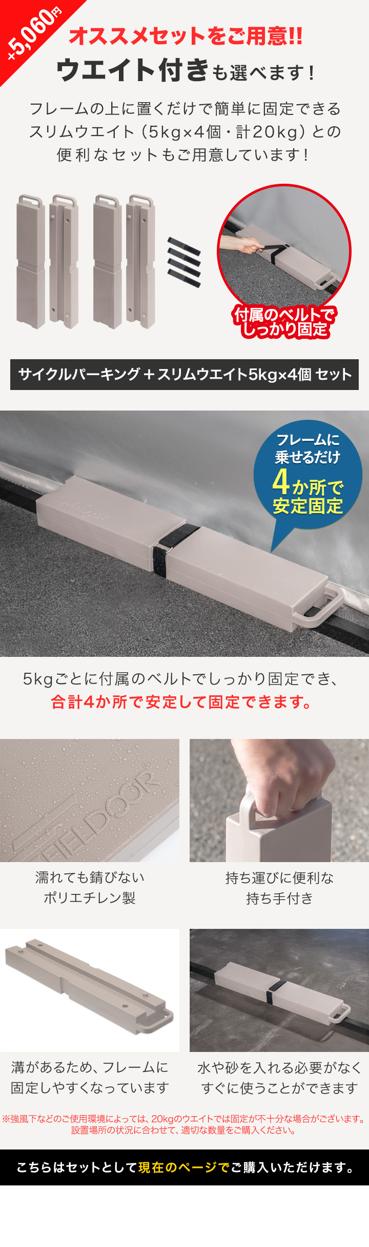 | 特記事項: ※上に立ったり、踏み台にするような行為はお止めください。 ※凹凸がある不安定な場所や濡れていたり、凍結していて滑りやすい場所等に設置しないでください。 ※強風下などのご使用環境によっては、20kgのウエイトでは固定が不十分な場合がございます。設置場所の状況に合わせて、適切な数量をご購入ください。。 |