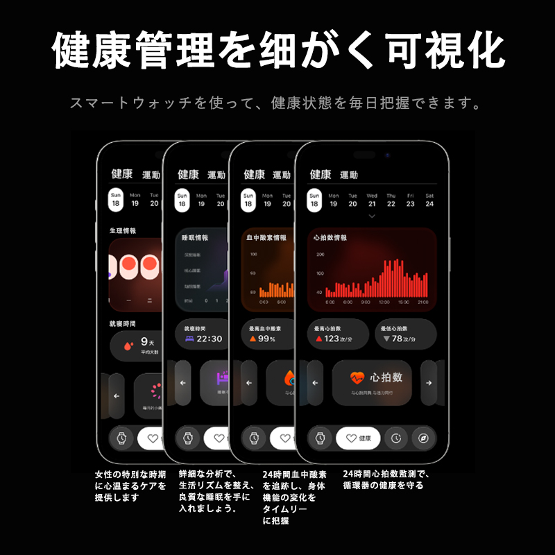 心拍数計測:24 時間連続で心拍を追跡、不規則な鼓動も検知して体調の変化を早めに察知