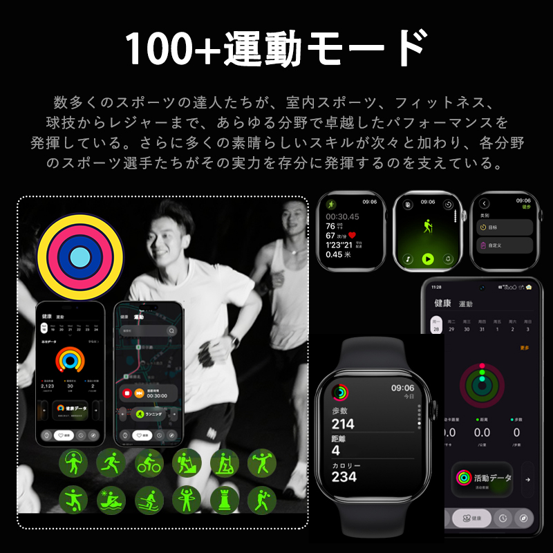ランニング・ウォーキング・サイクリングから、ヨガ・筋トレ・水泳(防水対応※)まで 100 種類以上のモードを搭載。