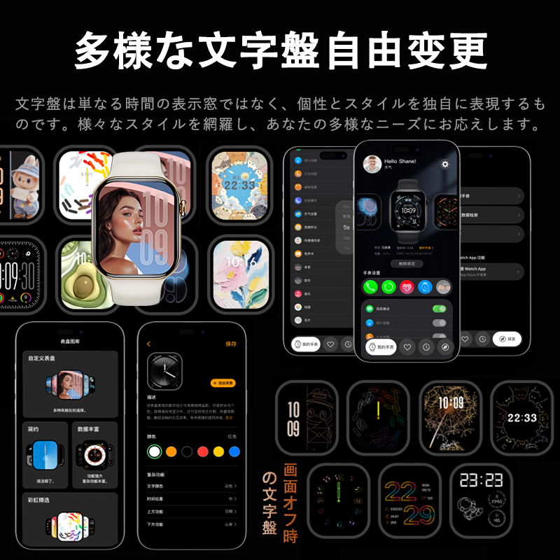 複数のウォッチフェイスから選択可能(時計・写真・グラフなど)、自分の好みやシーンに合わせてカスタマイズ