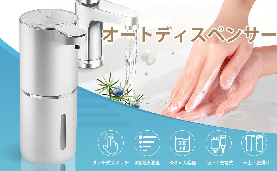 洗剤ディスペンサー ハンドソープ 自動 液体 食器用洗剤 詰め替え 持続液出し380ml 壁掛け 吐出量4段階調節 充電式 IPX5防水 オートディスペンサー 爆買