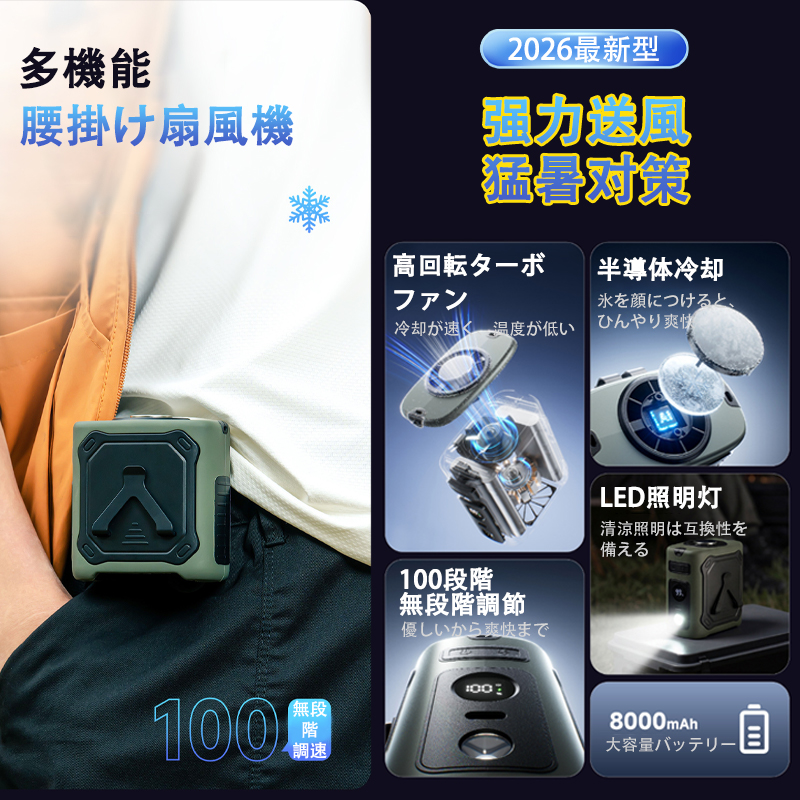 ウエストファン,クーラーファン,掛け式扇風機,ウエストクーラー,作業服扇風機,冷感機能付き,100 段階風量,8000mAh, 長時間稼働,Type-C 充電,デジタル表示,懐中電灯,SOS ライト,暑さ対策,熱中症予防,ウエスト取り付け,携帯扇風機,アウトドア,キャンプ,建設現場,外作業,扇風機 充電式,強力送風,軽量,グレー,カーキ,カーキグリーン,KLX07