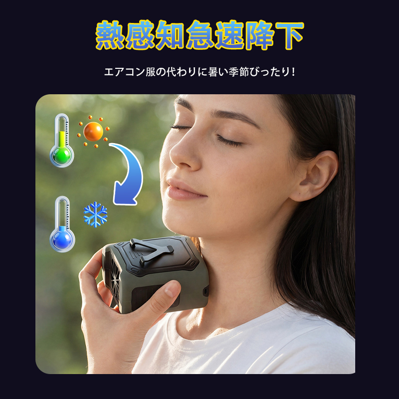 風速を 1〜100 段階まで細かく調整可能な100 段階風量設計により、微風から強風までシーンに合わせて使い分けられます。冷感機能付きの 2 段階切り替えにより、通常の送風に加えて肌を直接冷やす効果を実現し、真夏の暑さ対策や熱中症予防に最適です。