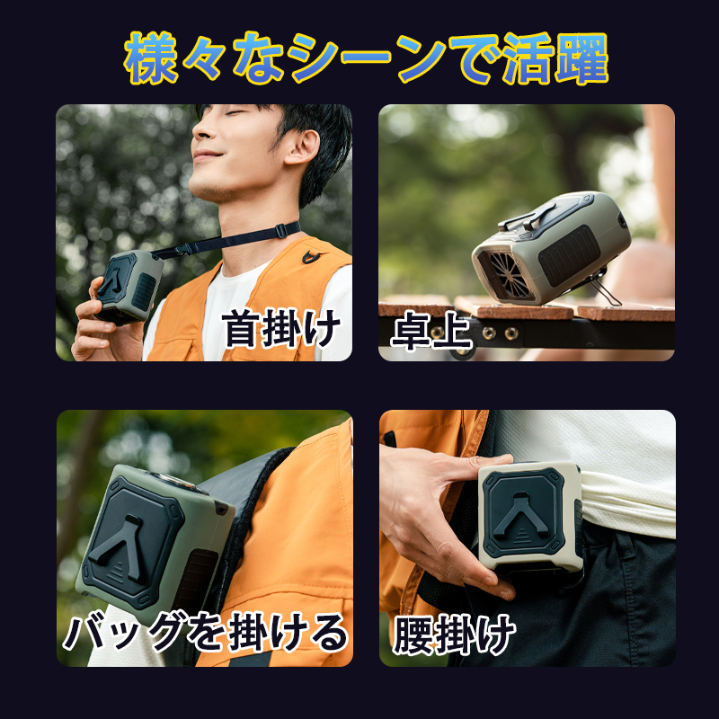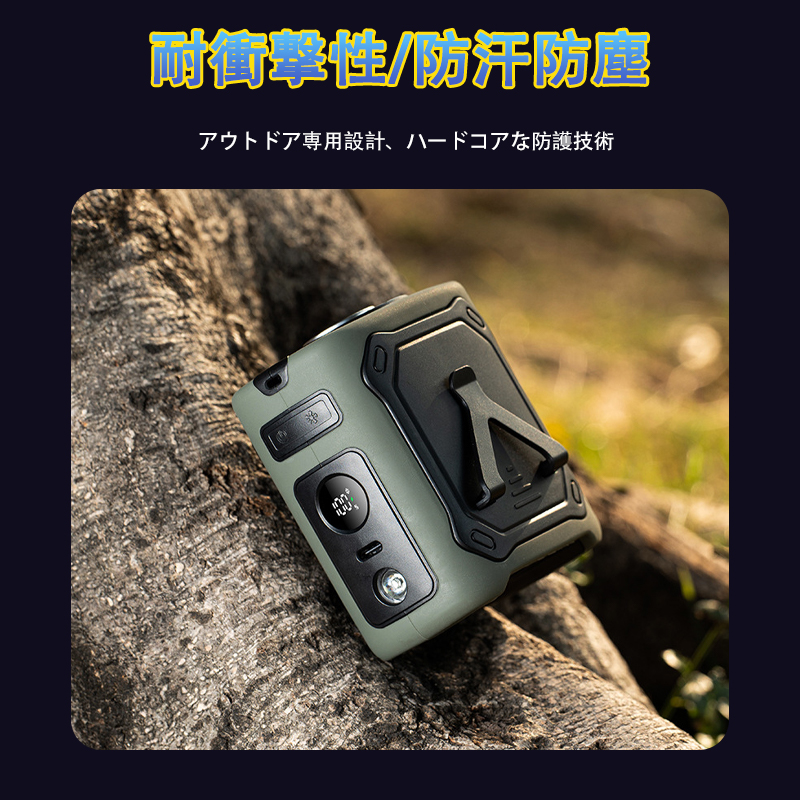 グレー・カーキ・カーキグリーンの 3 色展開で、好みや使用シーンに合わせて選べます。ABS/PC/ 金属 / シリコンを採用した高耐久素材で、作業用扇風機としての頑丈さを備え、長期間の使用に耐えます。充電式扇風機としての利便性と、現場用クーラーとしての実用性を両立した設計です。