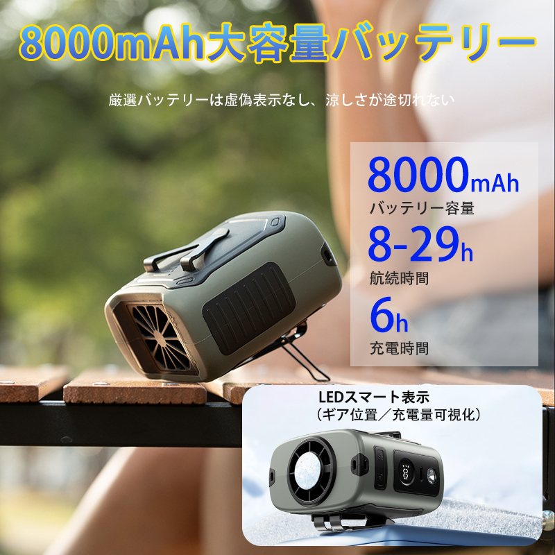 4000mAh×2 の8000mAh大容量バッテリーを内蔵し、風量 1 档で約 29 時間、100 档でも約 8 時間の長時間稼働を実現。Type-C 充電に対応し、約 6 時間でフル充電可能。大電池設計により、一日中の外作業や長時間のアウトドア・キャンプでも安心して使用できます。