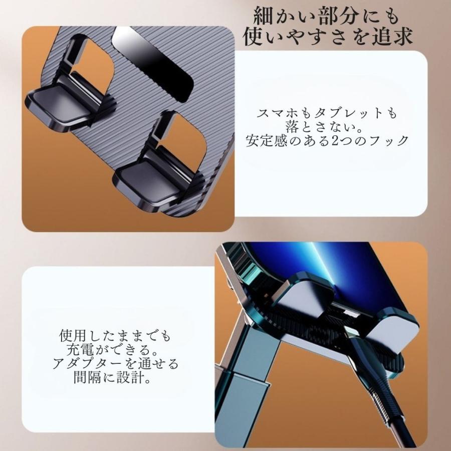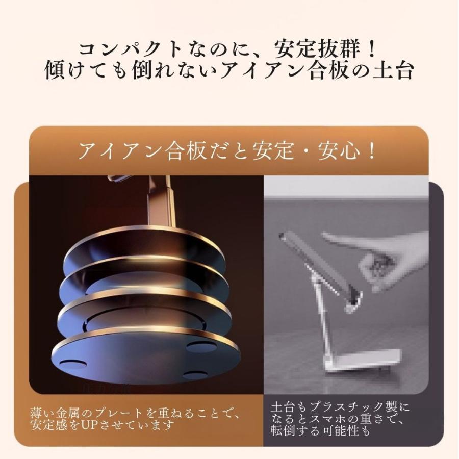 ・特徴:360°土台が回転するスマホスタンド。アームの伸縮や角度調整、土台の向きも変えられて自由にスマホやタブレットがおけるスタンドです。動画の視聴や細かい作業がしやすくなります。また、土台にはアイアン合板を使用しコンパクトながら安定感も抜群のスタンドになっています。