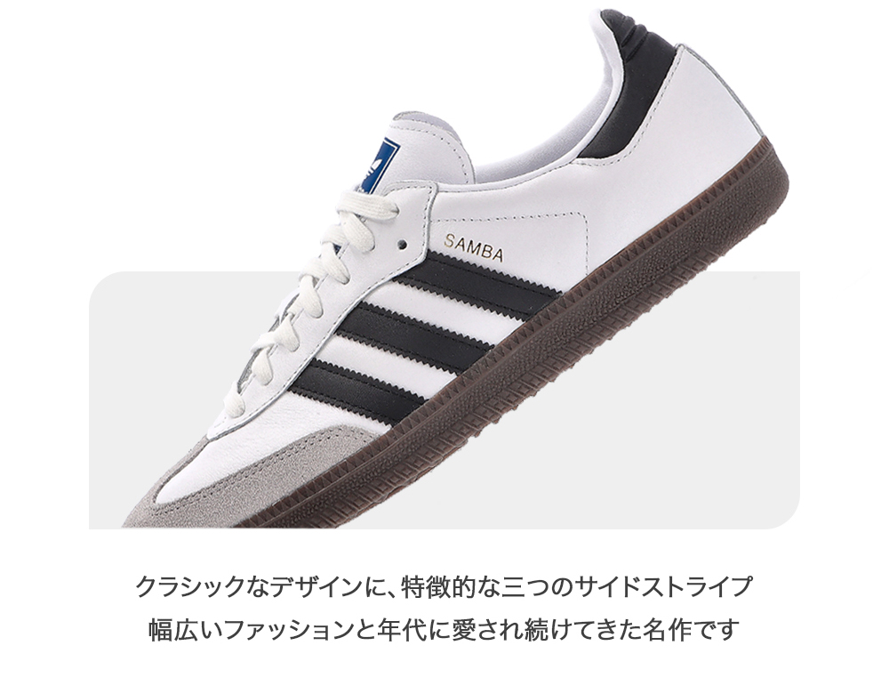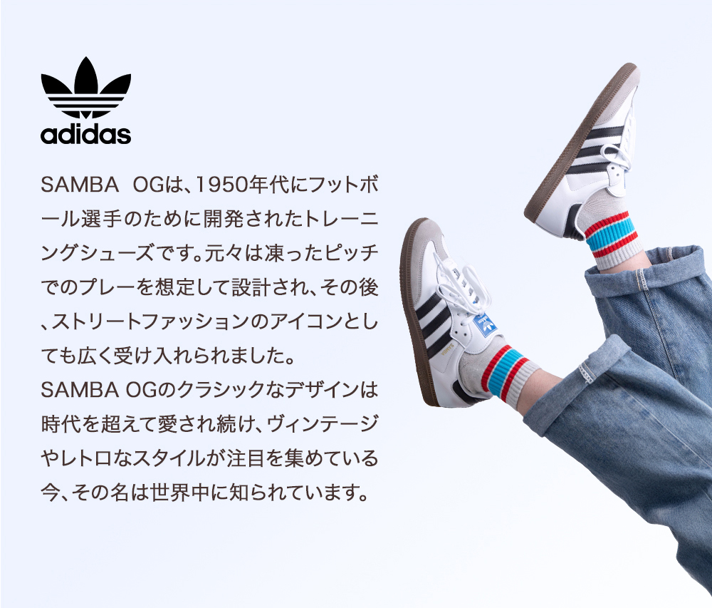 SAMBA OGは、1950年代にフットボール選手のために開発されたトレーニングシューズです。元々は凍ったピッチでのプレーを想定して設計され、その後、ストリートファッションのアイコンとしても広く受け入れられました。