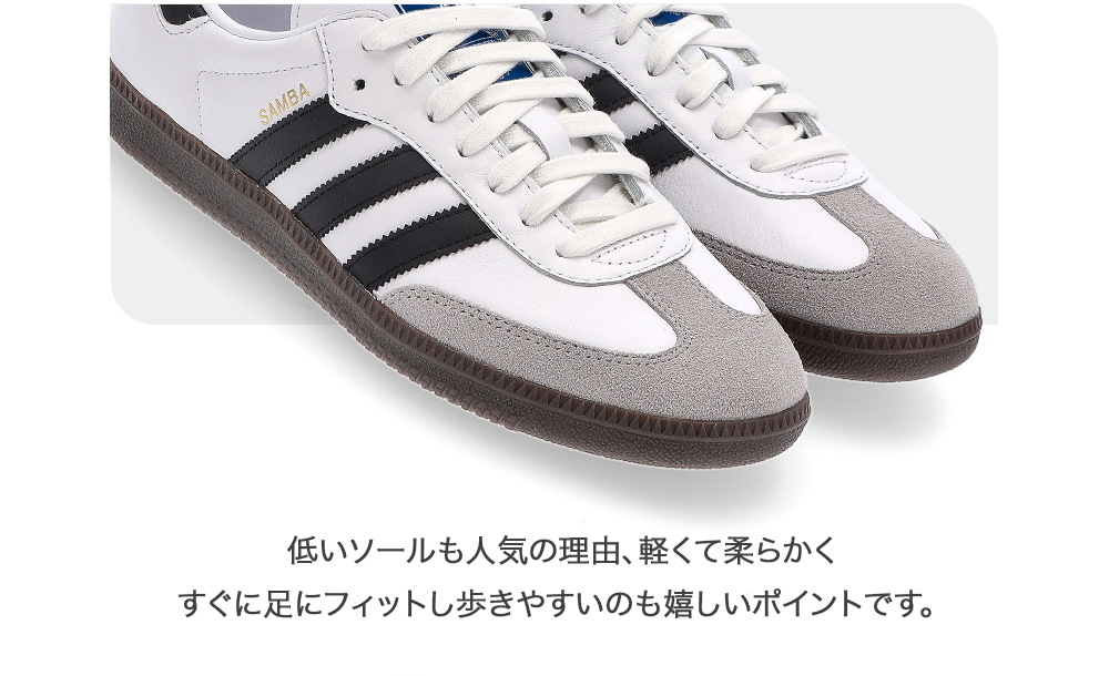 クラシックなデザインに、特徴的な三つのサイドストライプ、低いソールが人気の理由。また軽くて柔らかく、すぐに自分の足にフィットし歩きやすいのも嬉しいポイントです。