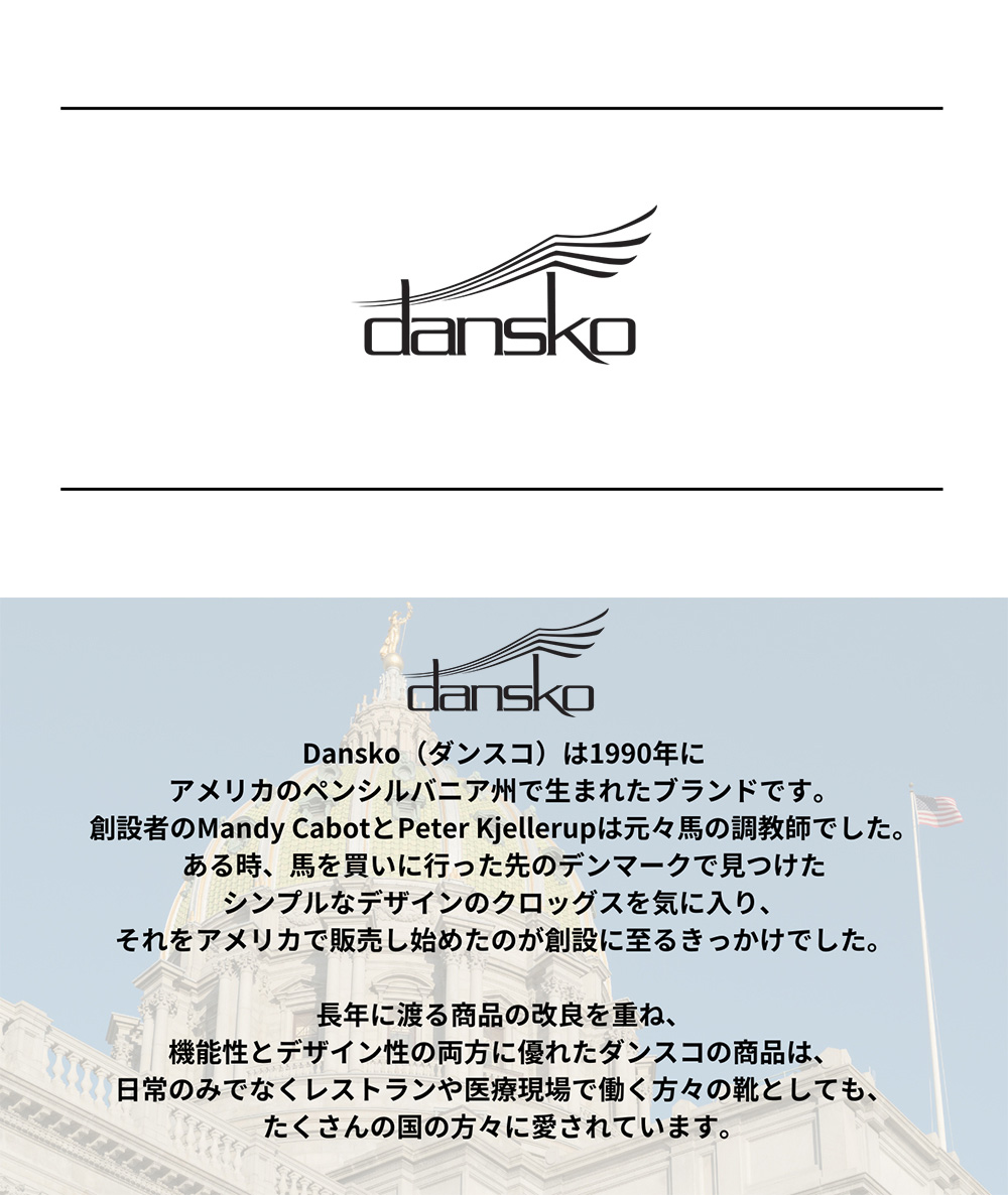 Dansko(ダンスコ)は1990年にアメリカのペンシルバニア州で生まれたブランドです。創設者のMandy CabotとPeter Kjellerupは元々馬の調教師でした。ある時、馬を買いに行った先のデンマークで見つけたシンプルなデザインのクロッグスを気に入り、それをアメリカで販売し始めたのが創設に至るきっかけでした。長年に渡る商品の改良を重ね、機能性とデザイン性の両方に優れたダンスコの商品は、日常のみでなくレストランや医療現場で働く方々の靴としても、たくさんの国の方々に愛されています。